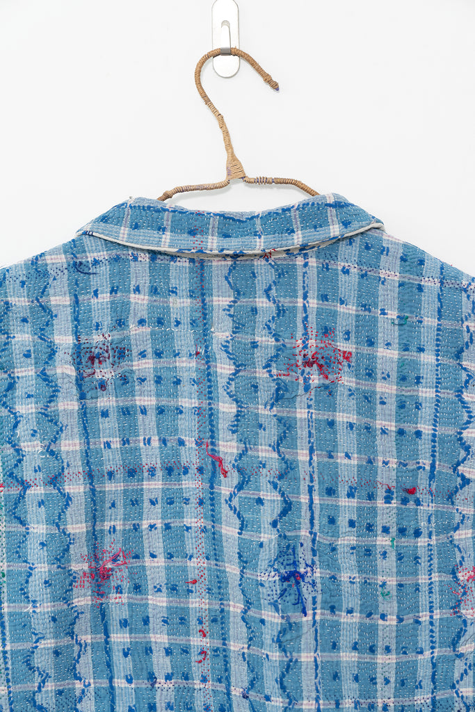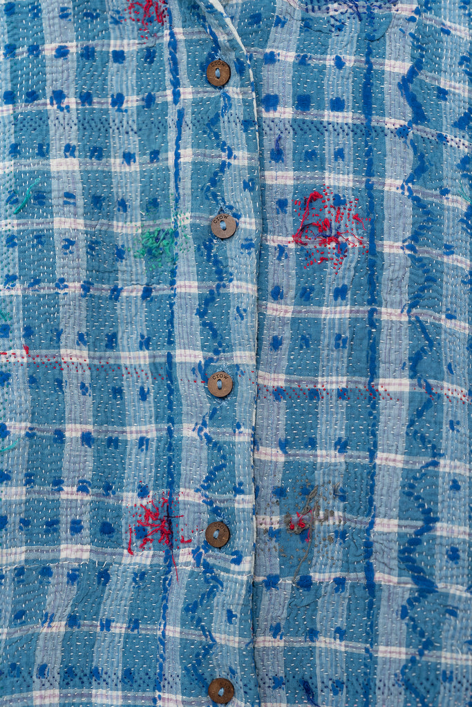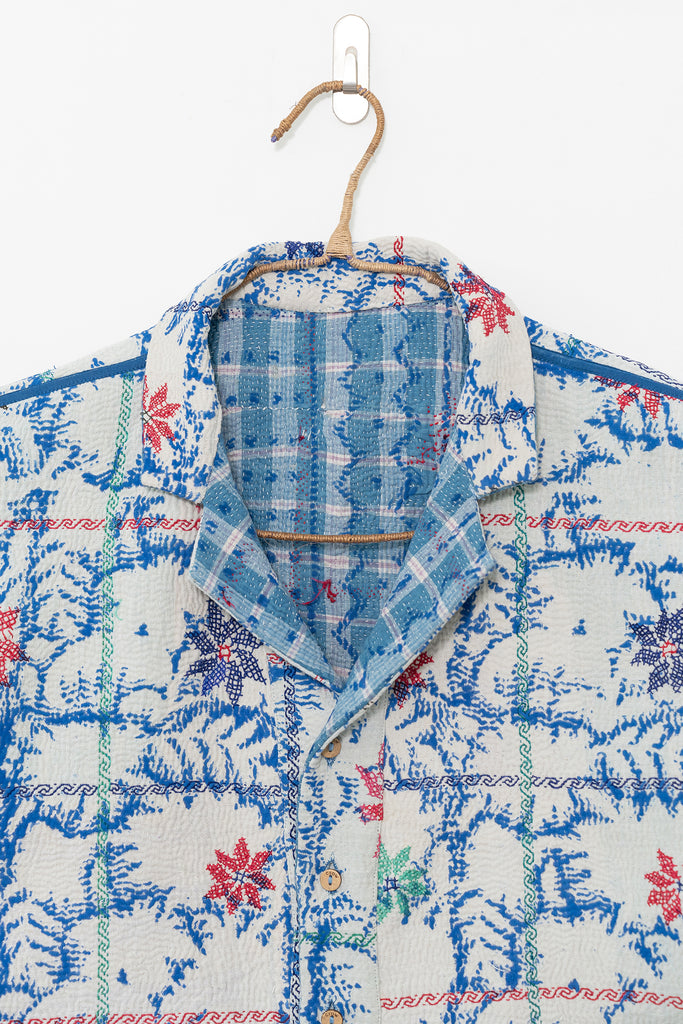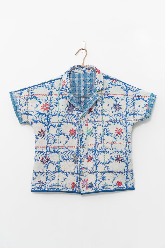 Alive with history and hand-stitching, this reversible shirt features blue kantha checks on one side and hand-embroidered florals on the other. A piece to live in — playful, poetic, and deeply personal.