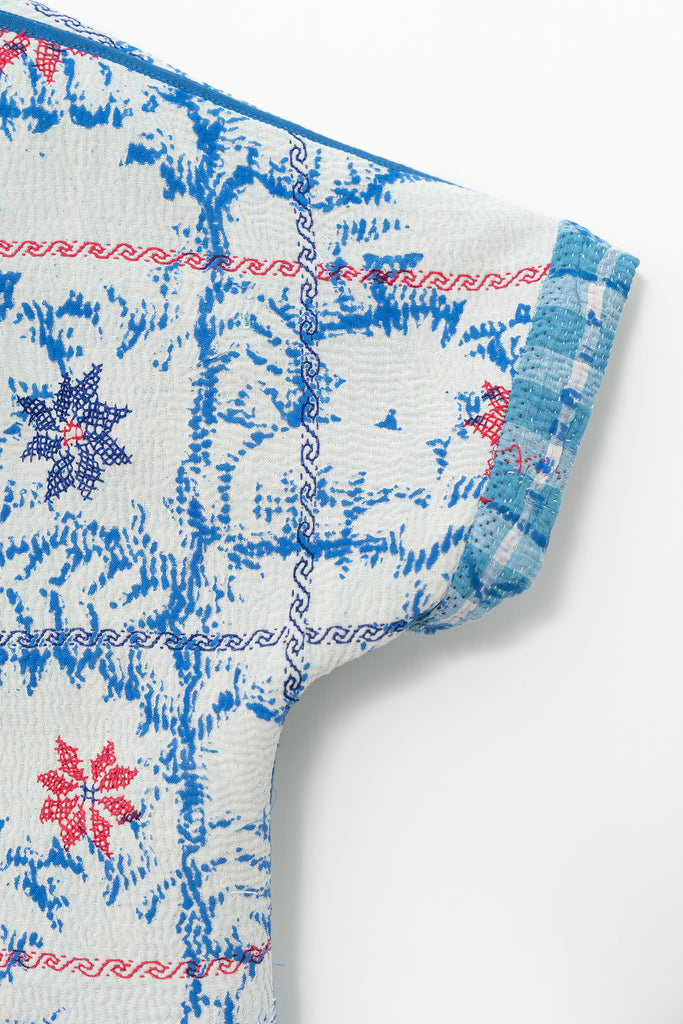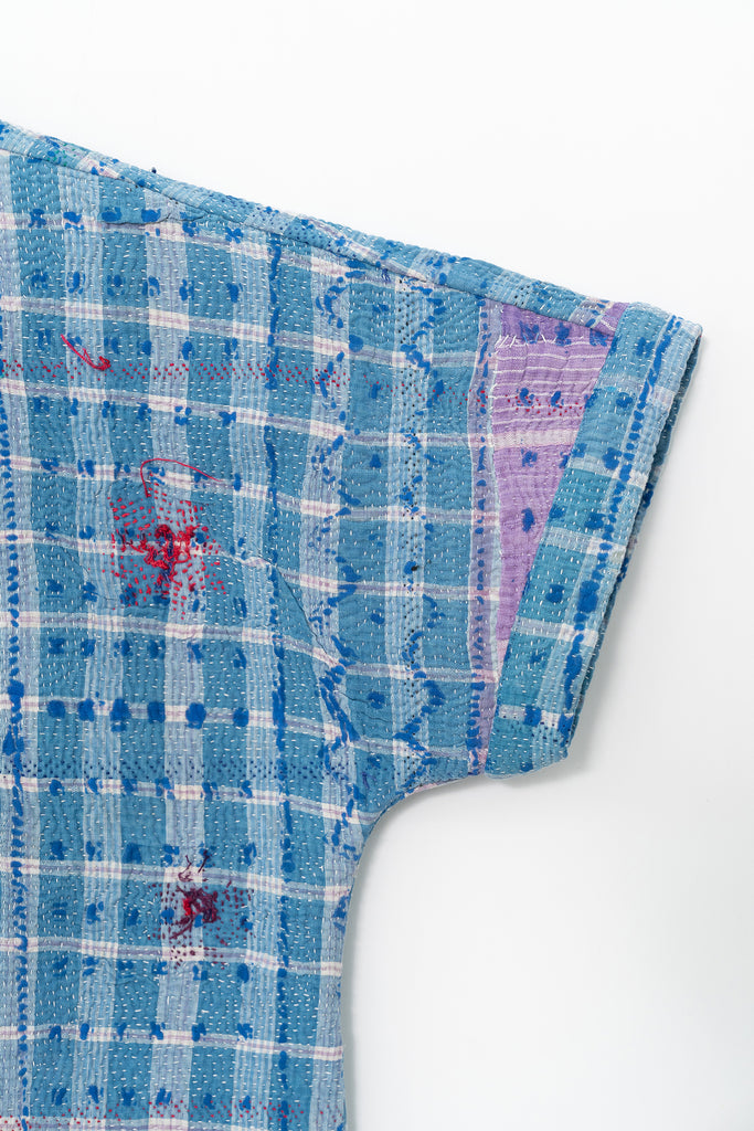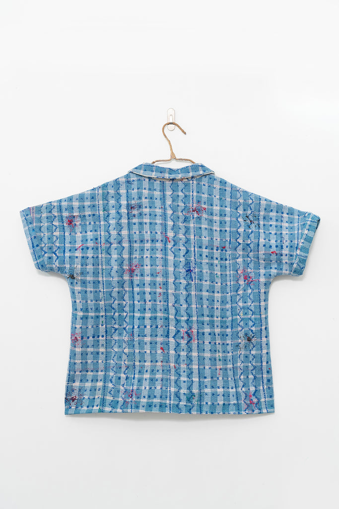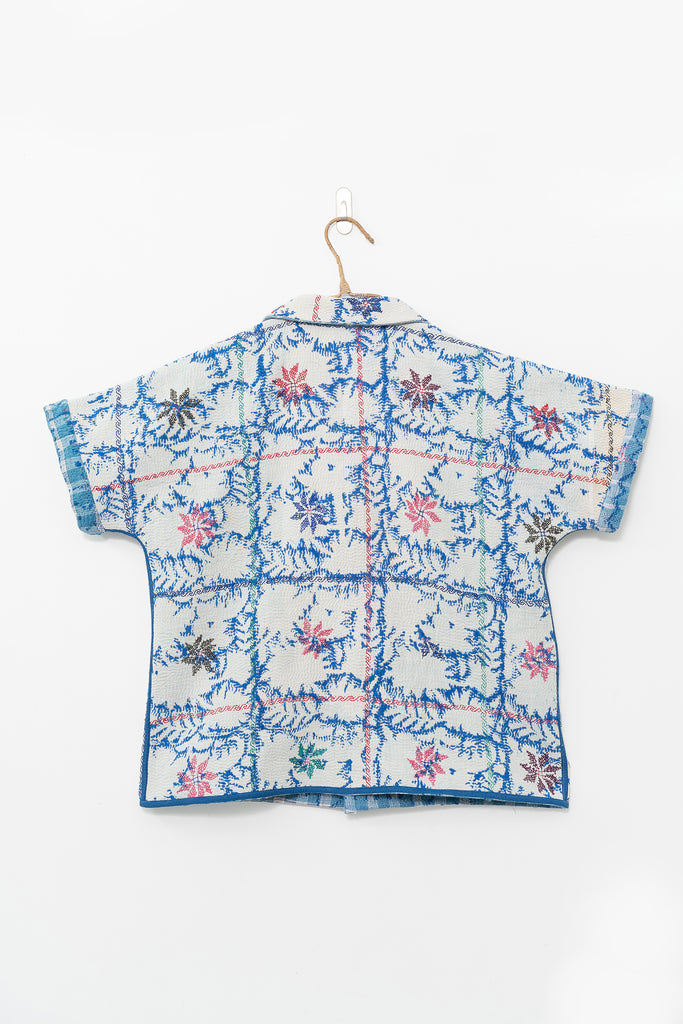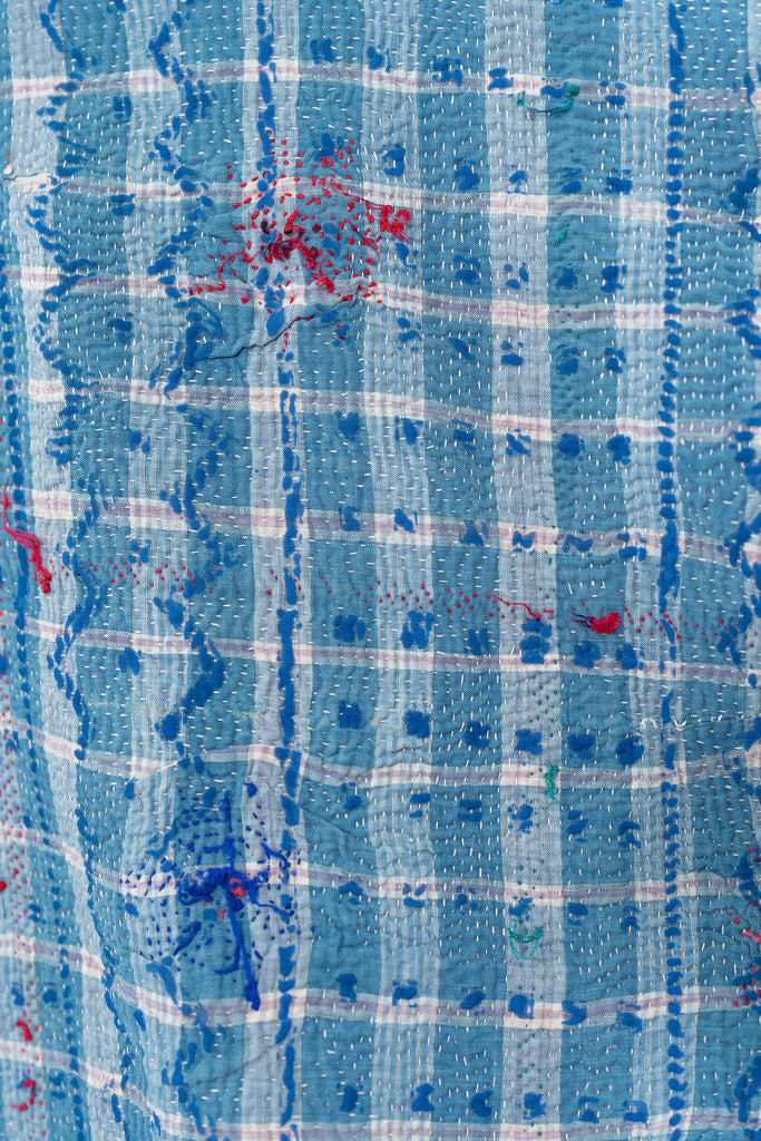 Alive with history and hand-stitching, this reversible shirt features blue kantha checks on one side and hand-embroidered florals on the other. A piece to live in — playful, poetic, and deeply personal.