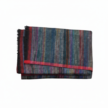 Envelop yourself in this hand woven pashmina shawl, a captivating blend of deep, elegant hues and vibrant vertical stripes. Lightweight yet warm, it's a timeless accessory perfect for adding an artistic and sophisticated touch to your style.