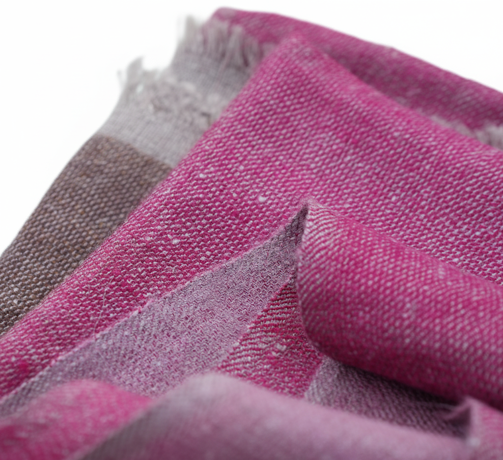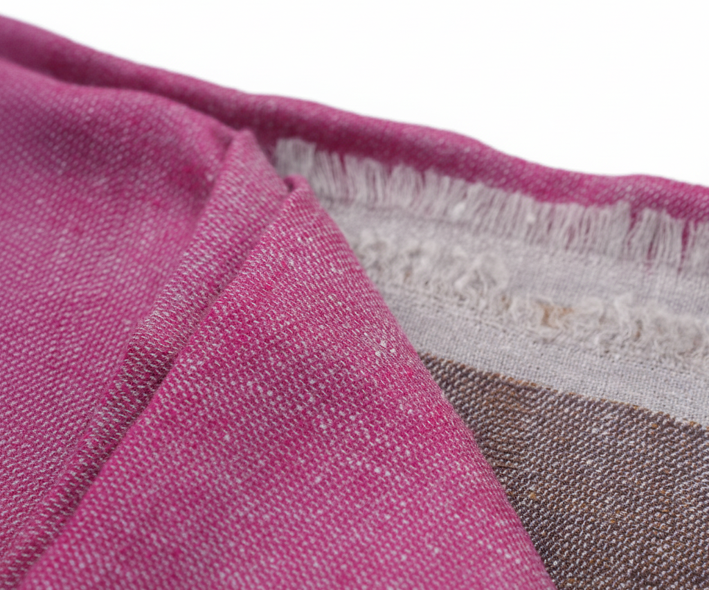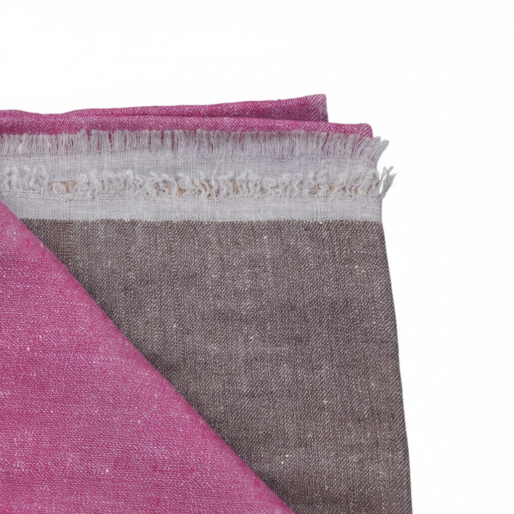 This is a reversible, two-tone Pashmina shawl with a bold color-block design. The top half is a vibrant fuchsia, while the bottom half is a rich chocolate brown. Its handcrafted quality is evident in the natural weave and multi-colored fringe.Wrap yourself in this piece to add a touch of sophisticated style and effortless elegance to your look.