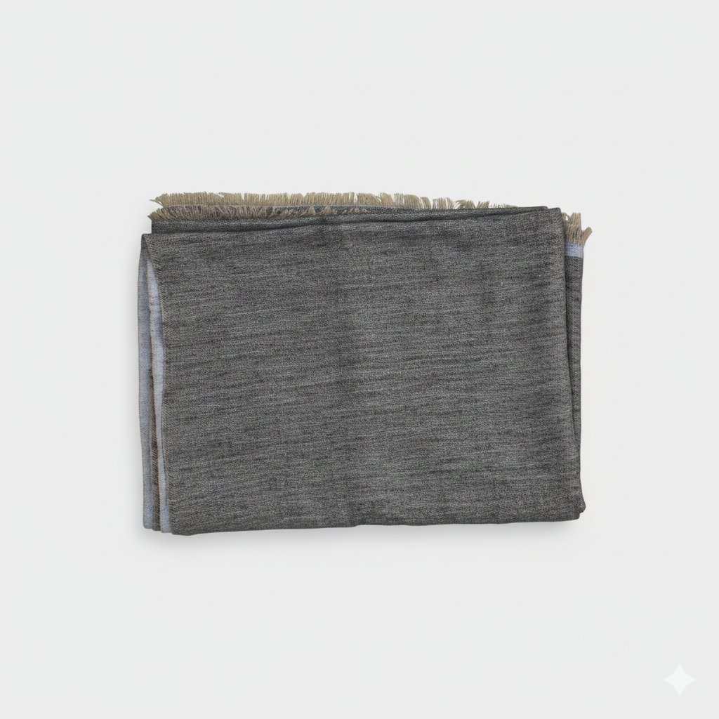 This is a beautiful, reversible Pashmina shawl that gives you two looks in one. One side is a heathered blend of dark brown and black, while the reverse is a solid medium gray. A thin border of contrasting colours runs near the fringe on both sides, highlighting its authentic, handwoven quality.