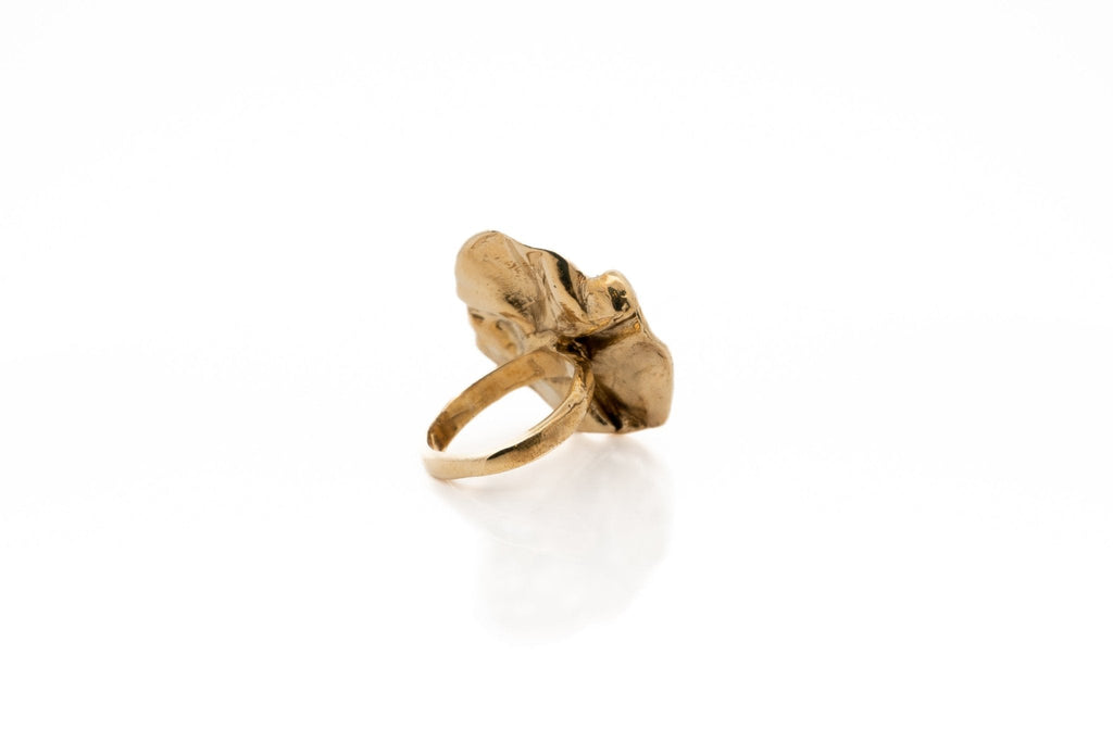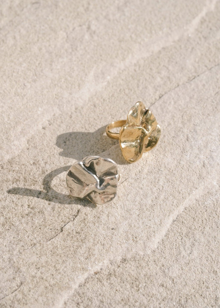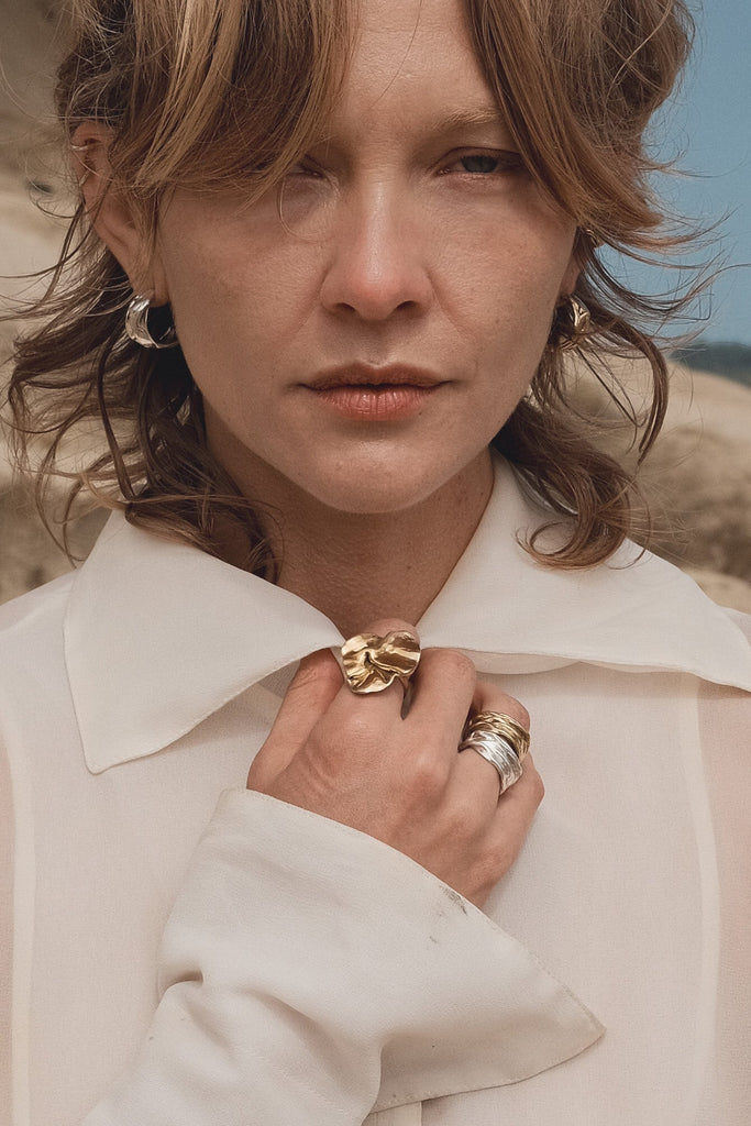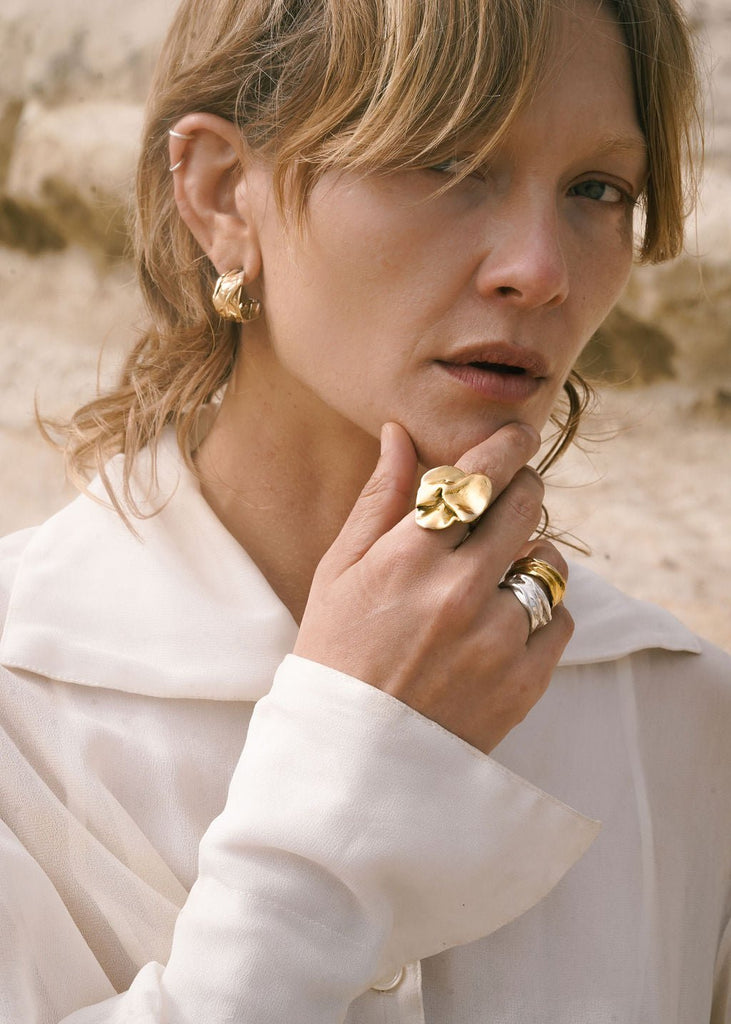 The Carrara Ring is a large, statement piece with a folded texture that resembles an abstract leaf shape. Crafted from an original wax carving and cast in recycled metals, this bold gold ring stands out in any jewelry collection. Its unique design and sustainable creation make it a perfect choice for those who appreciate both artistry and eco-friendly fashion.