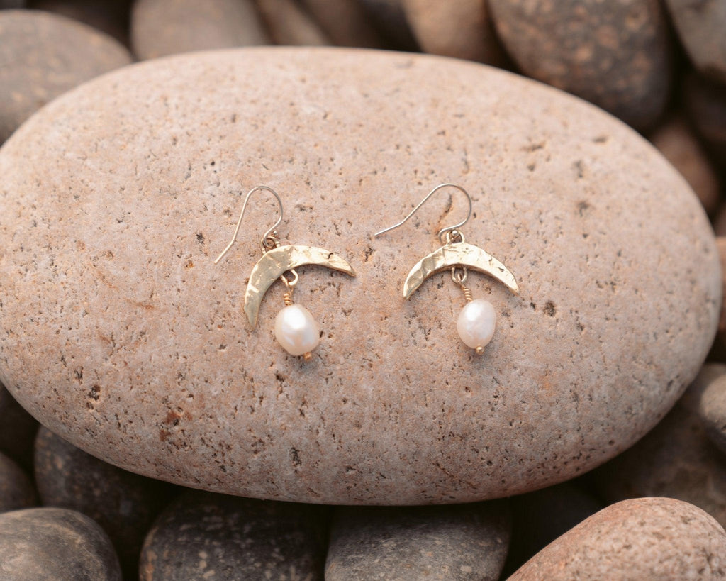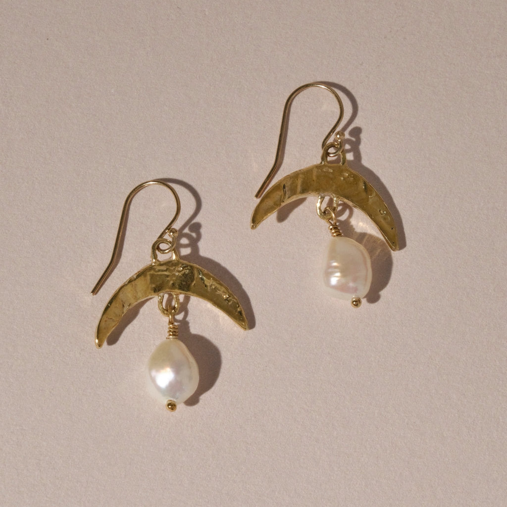 These unique Cressida Gold Pearl Moon Earrings are a sublime way to capture the power of the night sky. Hand sculpted crescent moons are adorned with drop pearl charms, they symbolize the timeless, feminine energy of the crescent moon, which has been woven into jewelry for centuries. Adorn yourself with the ultimate expression of femininity.