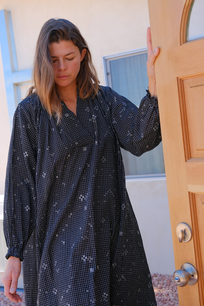 This elegant Jamdani dress is a beautiful take on a traditional silhouette. The dress features a high, ruffled neckline with a V-cutout and full, voluminous sleeves. Made from a lightweight, black fabric, it is adorned with a delicate grid pattern and geometric motifs woven throughout. The dress has a relaxed, free-flowing fit that falls gracefully, blending a modern, comfortable style with classic craftsmanship