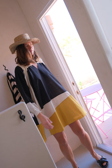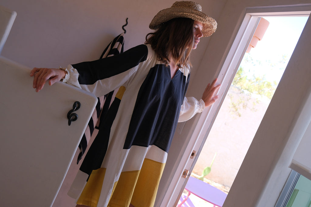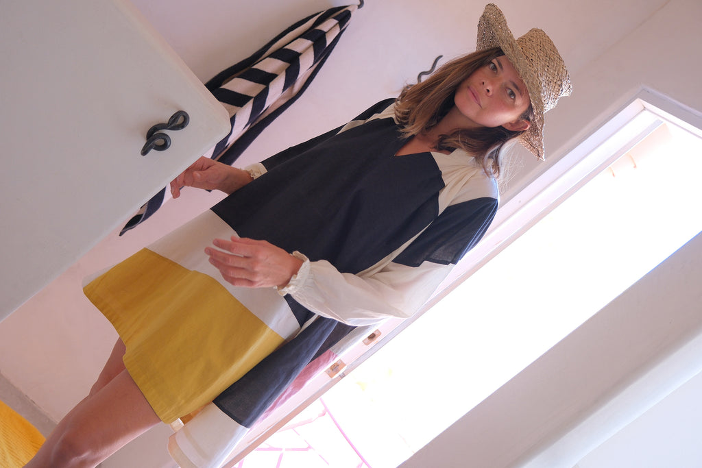 Tailored from soft & natural cotton fabric, the color-blocked patchwork dress is a modern minimalist piece with free-flowing charm. Designed to pull off on any occasion. Thoughtful details like patching together unstructured shapes, vintage-inspired cuffs with frill details, and gatherings around the neckline lend versatility to the outfit for your next spring holiday.