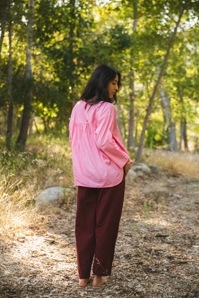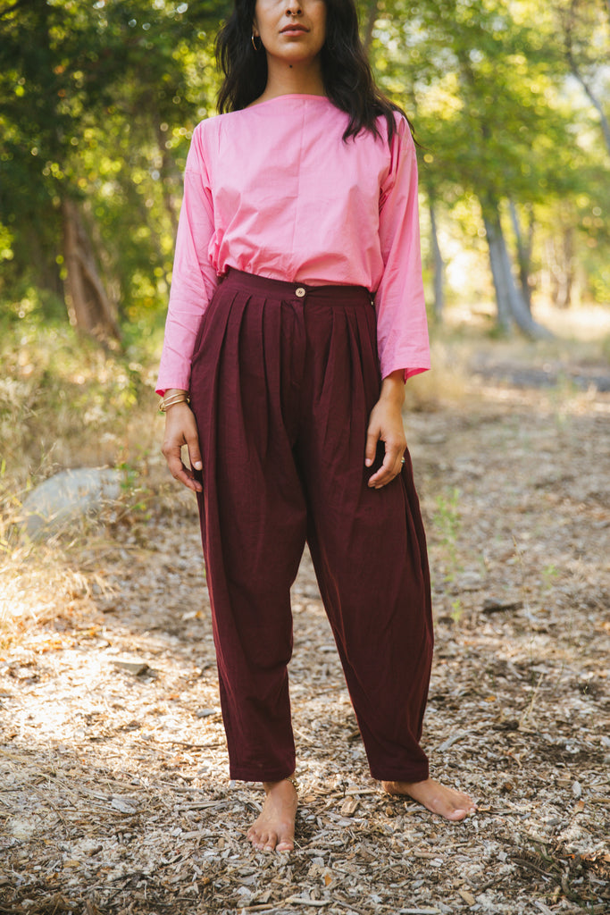 Designed in collaboration with Meredith Peck, these stylish maroon trousers blend comfort with a polished design. They feature a comfortable, elasticized waist at back and deep pleats that create a relaxed, voluminous fit that gracefully tapers at the ankle. Complete with convenient side and back pockets, this piece is perfect for a chic daytime look when paired with a simple tee or tank.