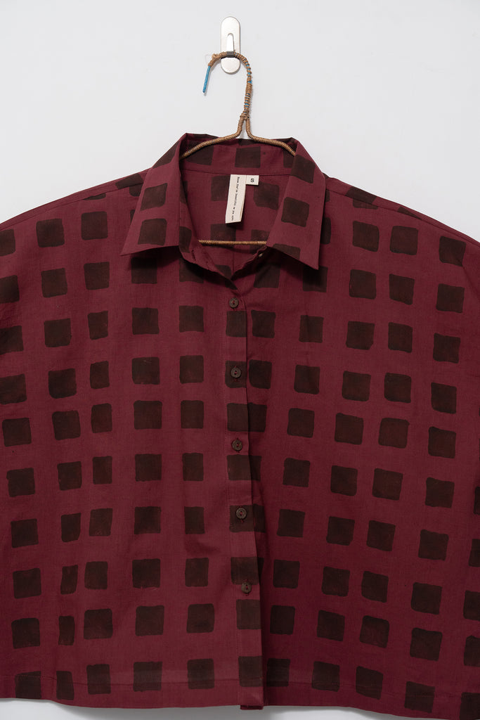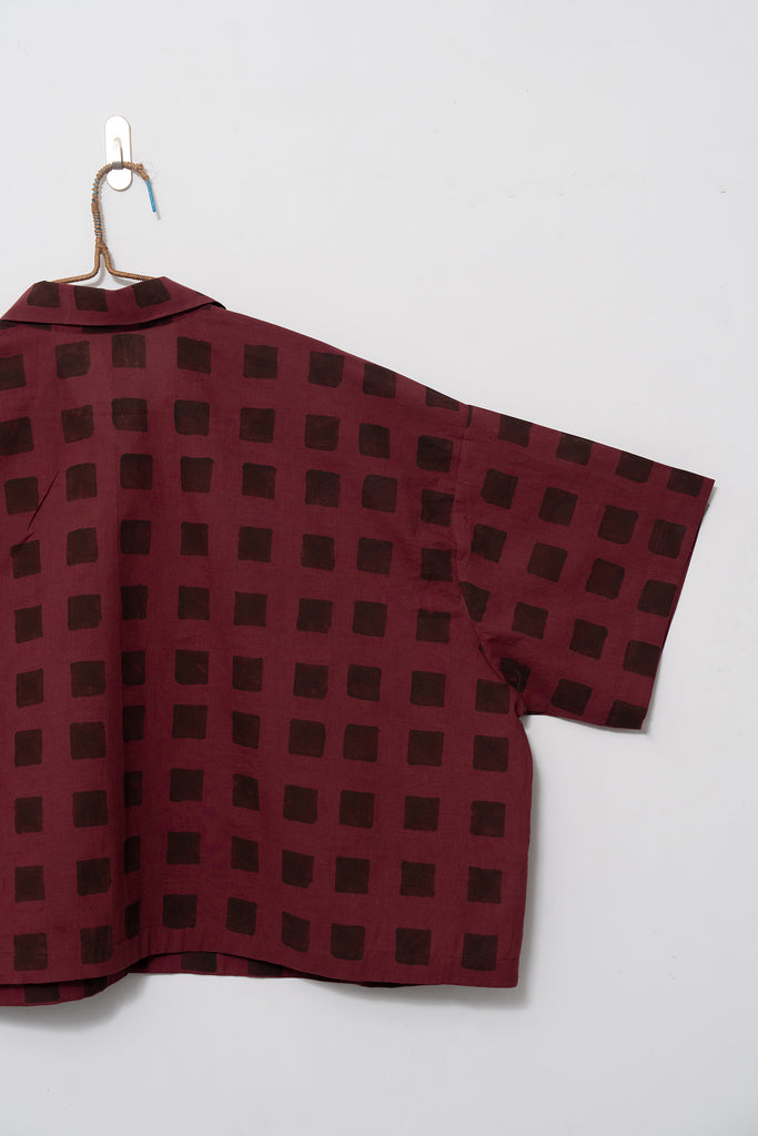A contemporary take on timeless craft, this shirt features hand-blocked squares in deep cocoa on a rich burgundy base. Printed on assumed handwoven organic cotton with azo-free dyes, the bold, graphic grid pattern celebrates individuality and a standout aesthetic. A relaxed, oversized fit and classic button-down design make it a versatile, impactful staple.