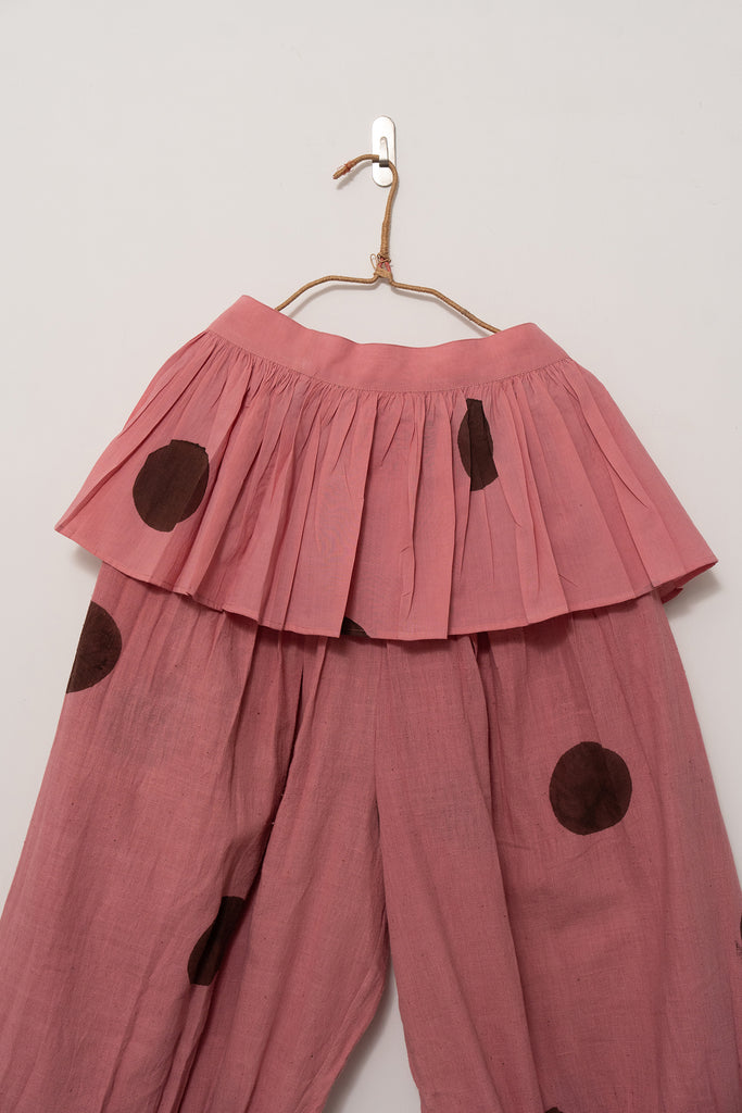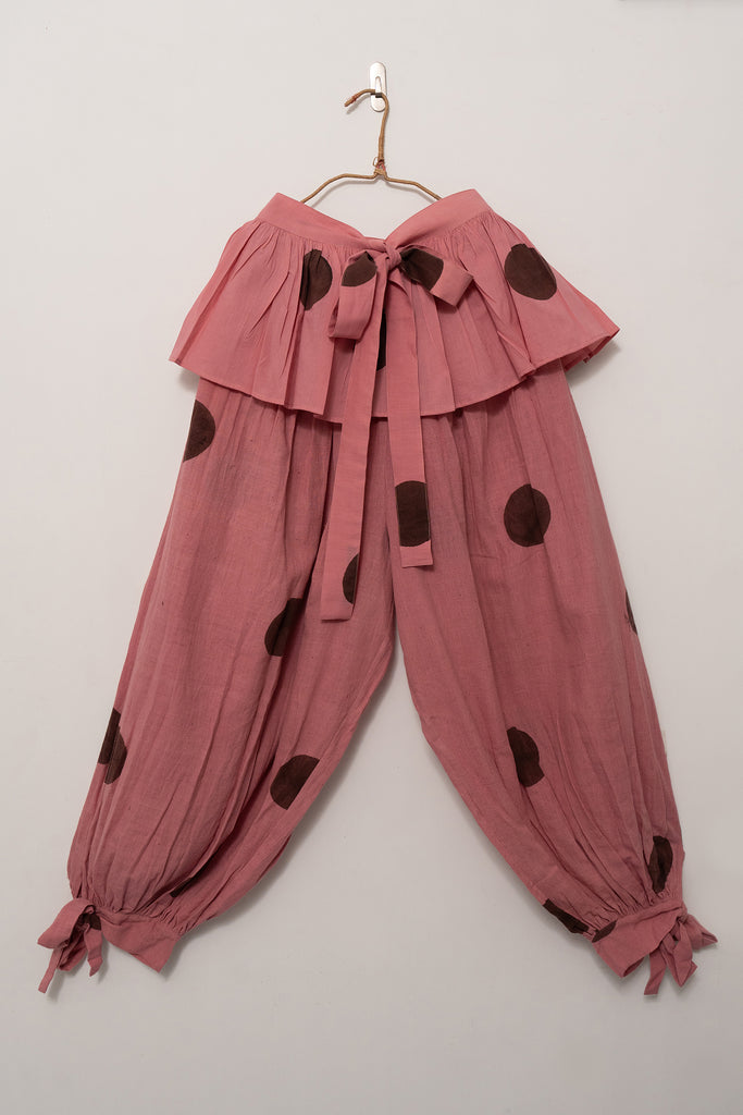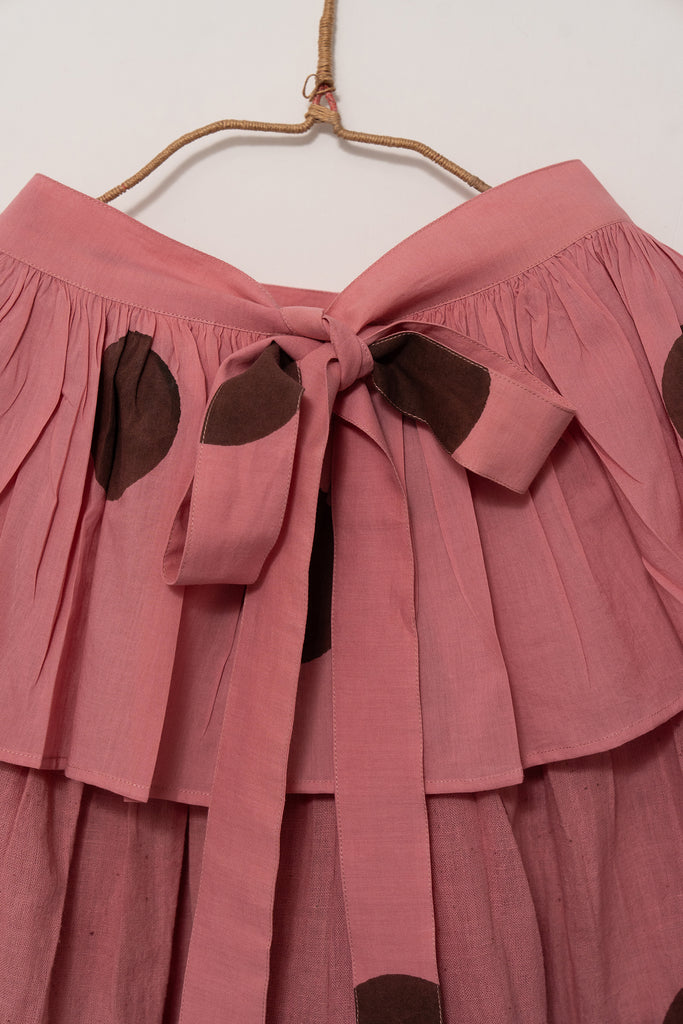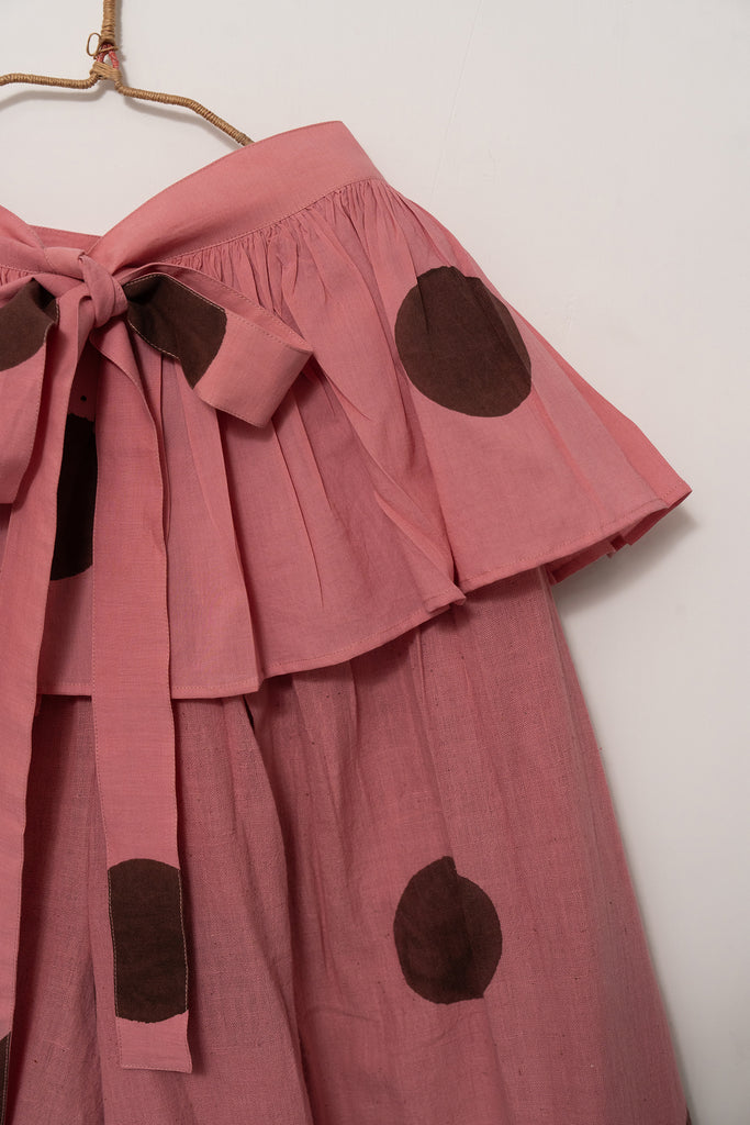 Designed in collaboration with Meredith Peck, this wrap skirt captures playful elegance through hand-blocked cocoa dots on rose-pink organic cotton. Crafted with azo-free dyes, it ties neatly at the waist, offering a flexible fit and a flared silhouette that transitions effortlessly from casual to festive.