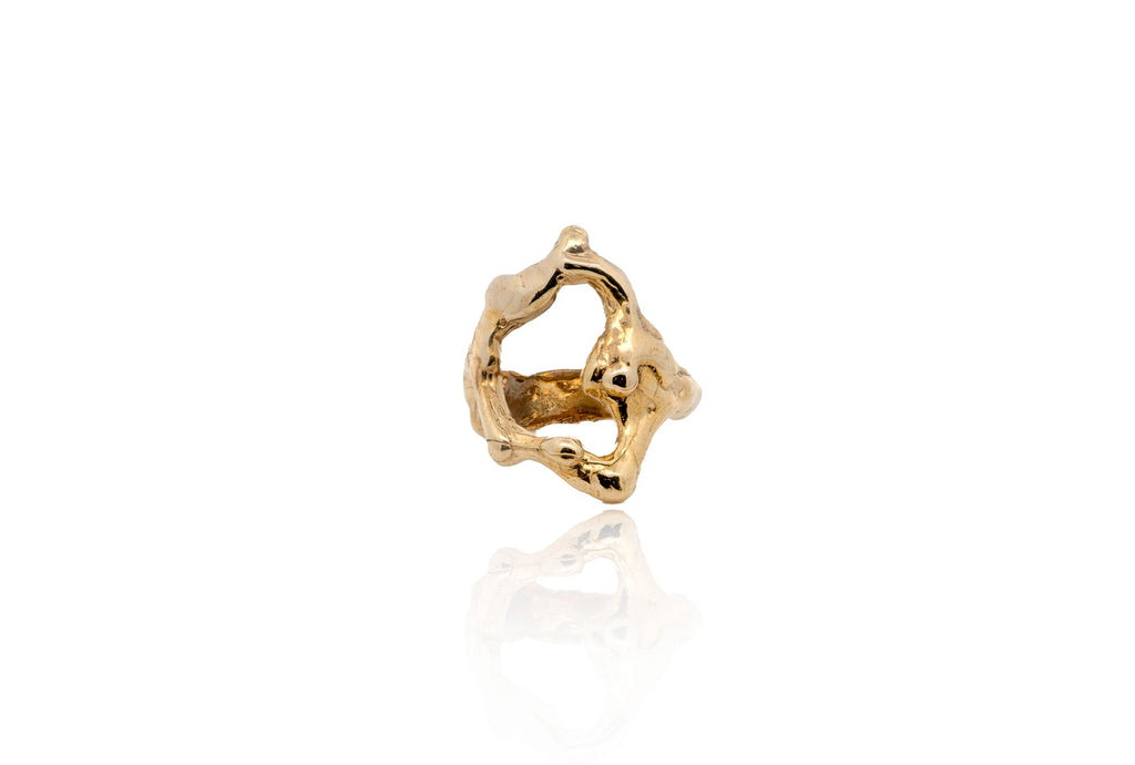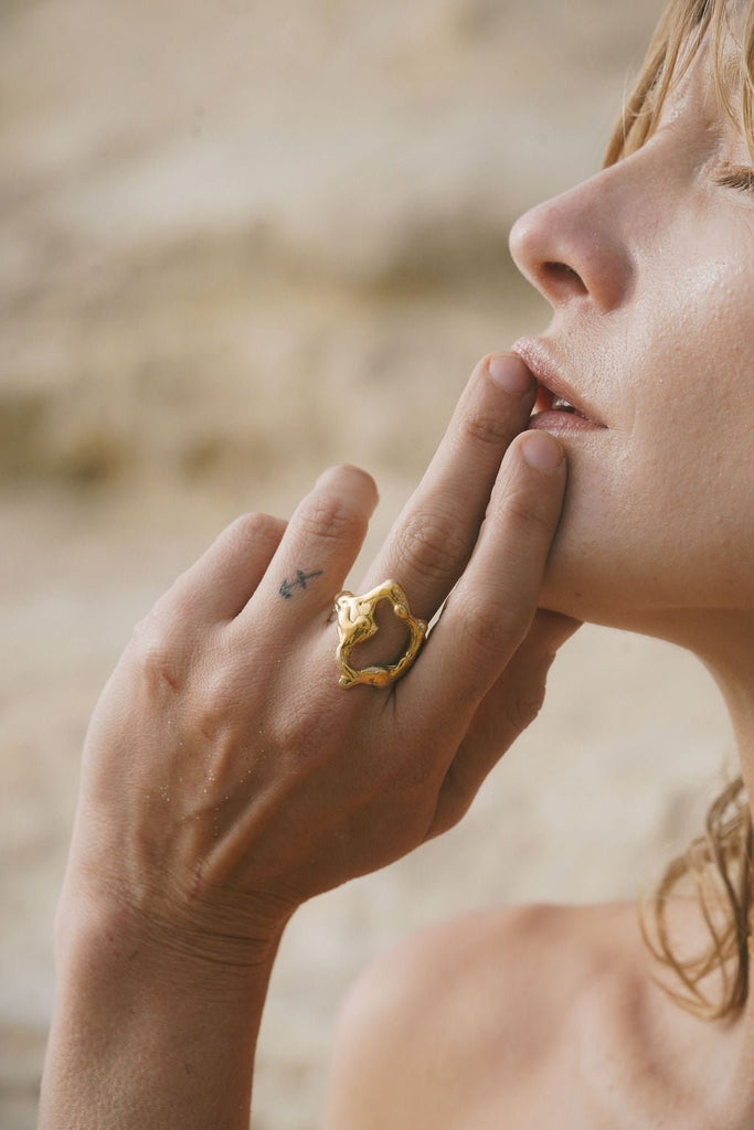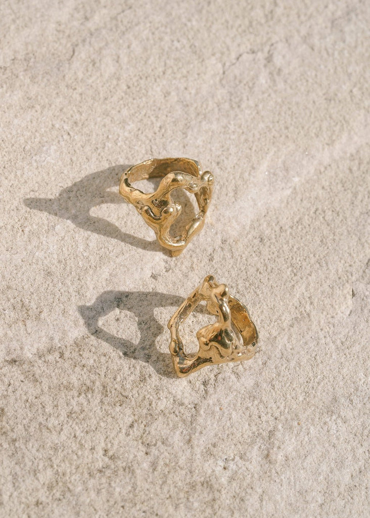 The Tecopa Ring is a bold, abstract piece inspired by the Tecopa Hot Springs in the Mojave Desert. This large ring features an open shape with a distinctive melted texture, capturing the raw and rugged beauty of its namesake. Handcrafted from an original wax carving and cast in recycled brass, the Tecopa Ring embodies modernist and brutalist design principles.