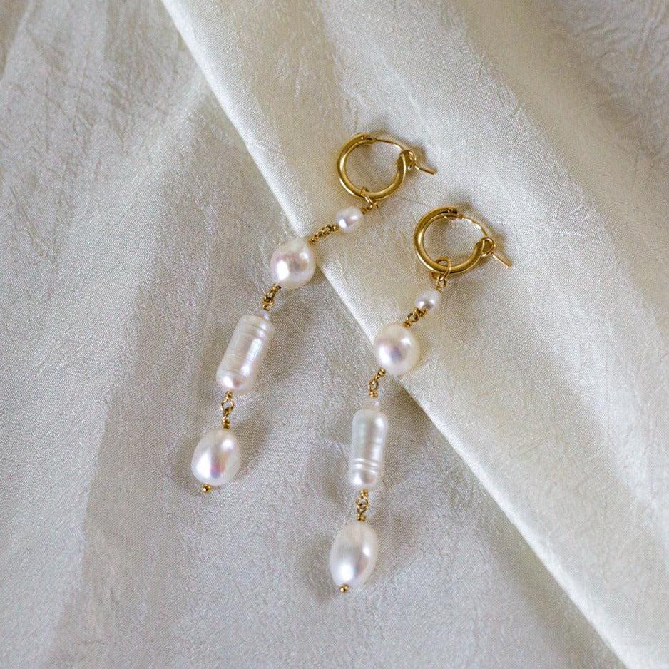 Pearl Hoop Drop Earrings that are unique and elegant. These pearl duster earrings are designed with 4 freshwater pearls in various shapes and sizes and then interconnected with delicate hand wrapped wire.