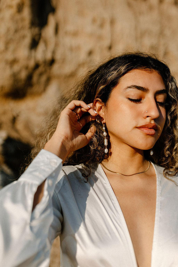 These pearl drop earrings attach to a modern 13mm gold fill hoop or sterling silver hoop. The hoop earring is complete with a snapping back so these chain drop earrings stay secure. Beautiful for a modern bride or anytime you want to elevate your look.
