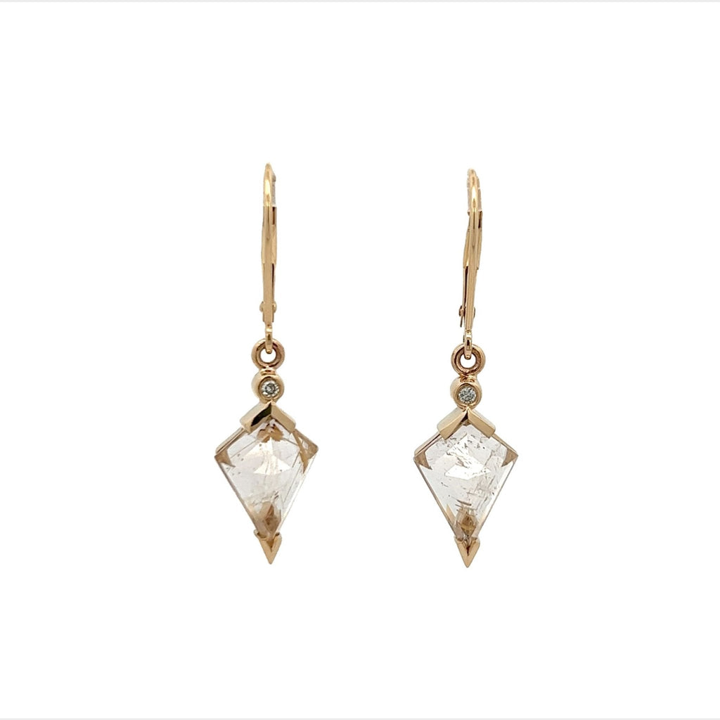 Thin, hairlike strands of golden rutiles are encased in a clear quartz kite shaped gemstone and accented with a small diamond and set in 14k yellow gold. Finished with a 14k solid gold leverback earwire to ensure the earrings security.
