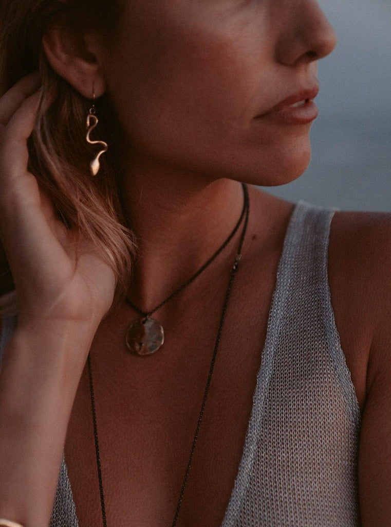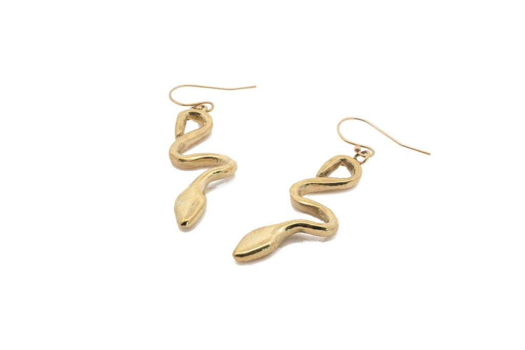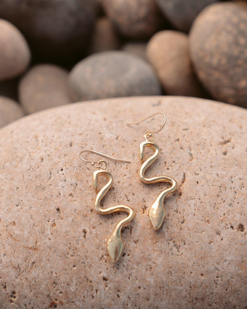 Our Serpentina Gold Snake Dangle Earrings are hand-sculpted to form a sinuous and captivating figure, weaving its way from the ear like the winding path of a serpent. These earrings are lightweight and have great movement making them a statement of enchanting beauty, symbolizing rebirth and transformation.