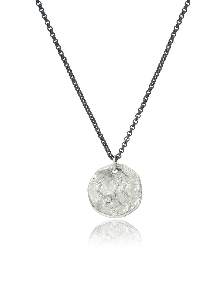 This Silver Lunar Gemstone Necklace showcases a hand-sculpted medallion, capturing the mysterious allure of the full moon. Showcasing a textured design, the necklace features flush-set stone options of black spinel, garnet, or white topaz, hung on a luxuriously contrasting oxidized black sterling chain. An elegant and exclusive piece, this necklace is sure to make a truly sophisticated statement.