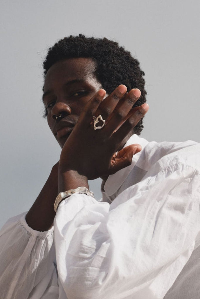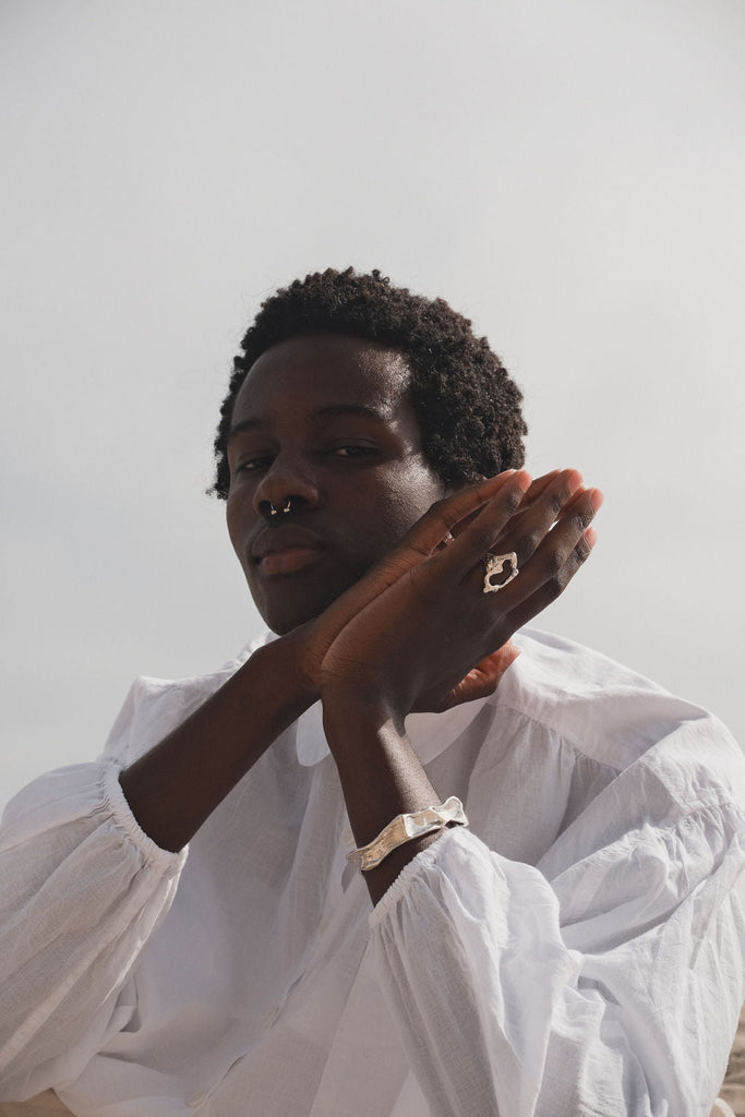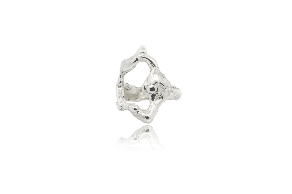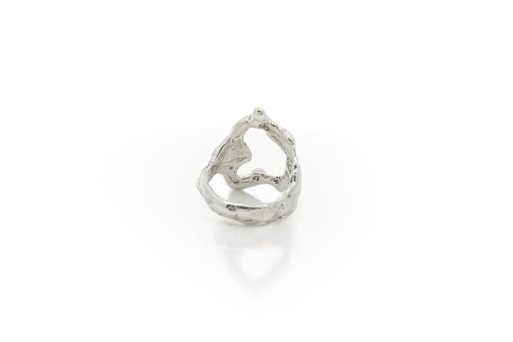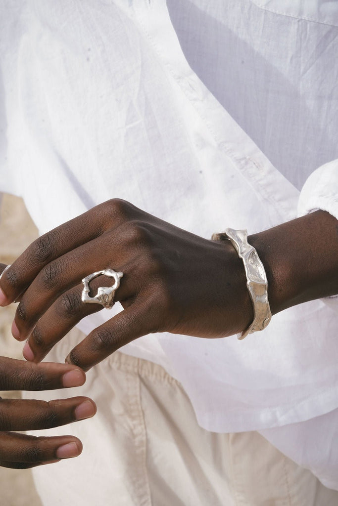 The Tecopa Ring is a bold, abstract piece inspired by the Tecopa Hot Springs in the Mojave Desert. This large ring features an open shape with a distinctive melted texture, capturing the raw and rugged beauty of its namesake. Handcrafted from an original wax carving and cast in recycled sterling silver, the Tecopa Ring embodies modernist and brutalist design principles.