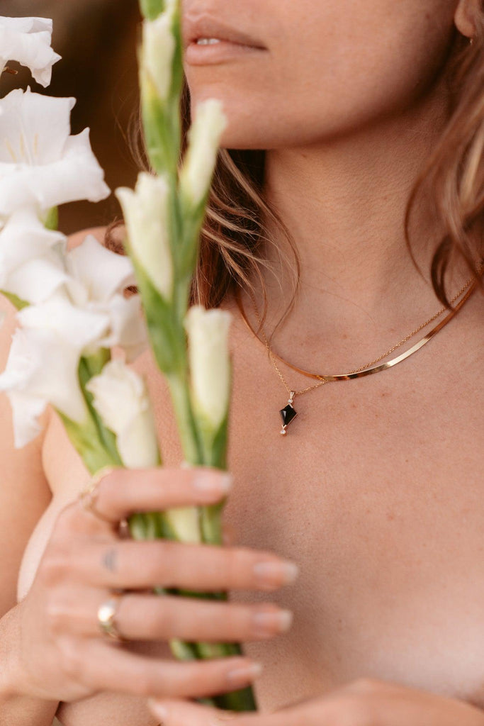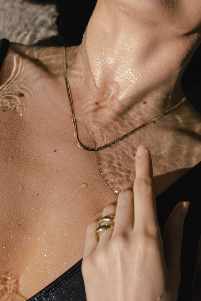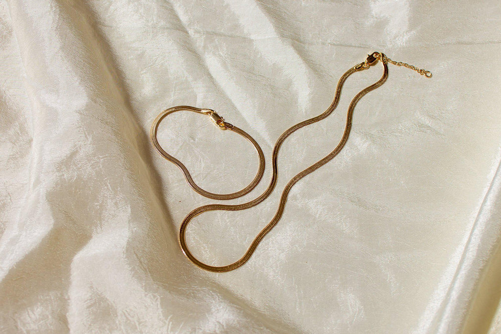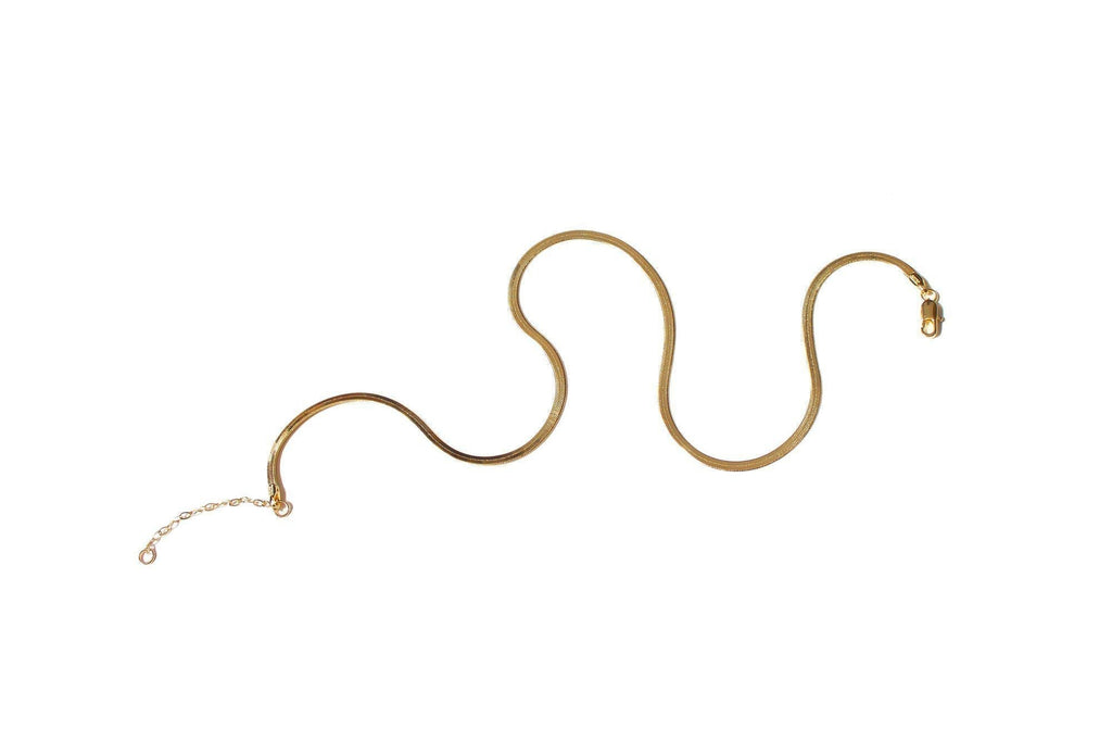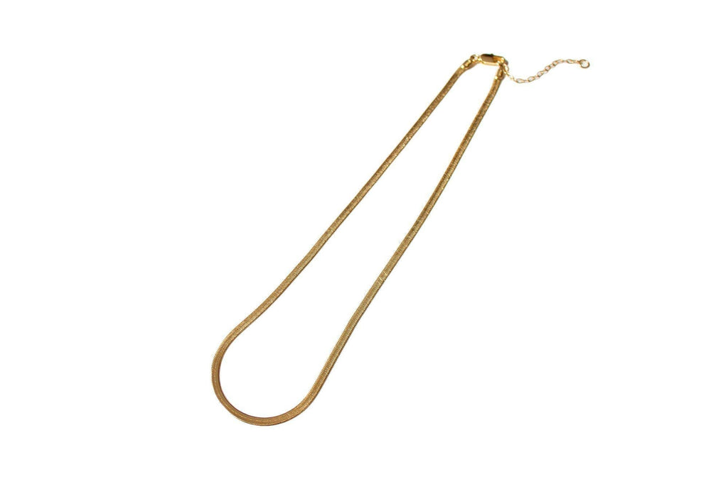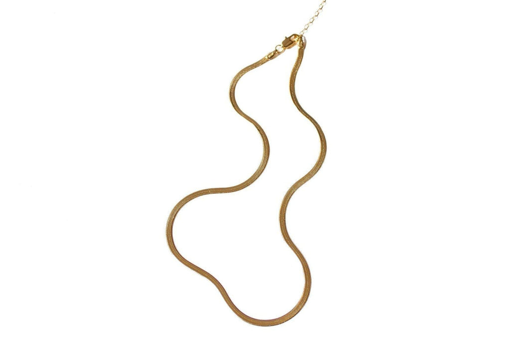 Liquid gold best describes this flat herringbone chain necklace. Flat Herringbone chain catches the light and sits on your skin in the most graceful and slinky way. The shorter length of this flat gold necklace makes a great base layer and the longer length looks perfectly sexy on its own.