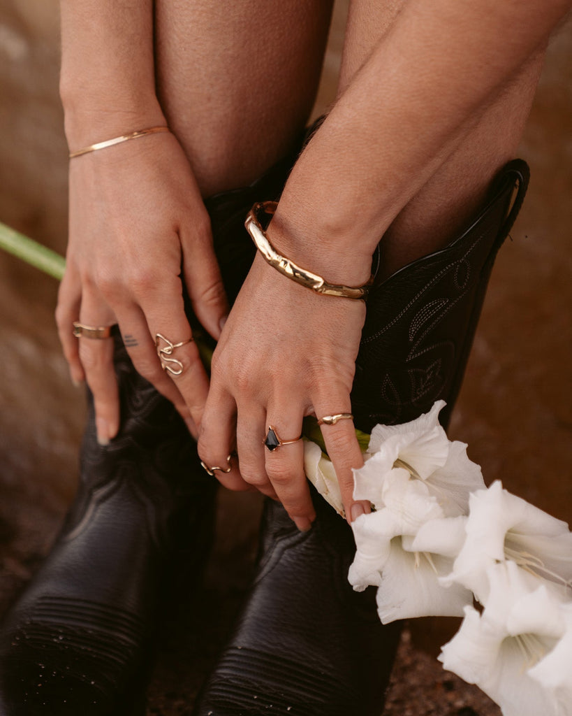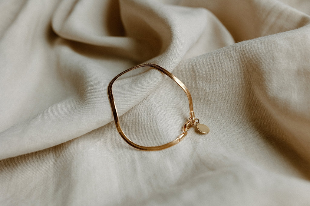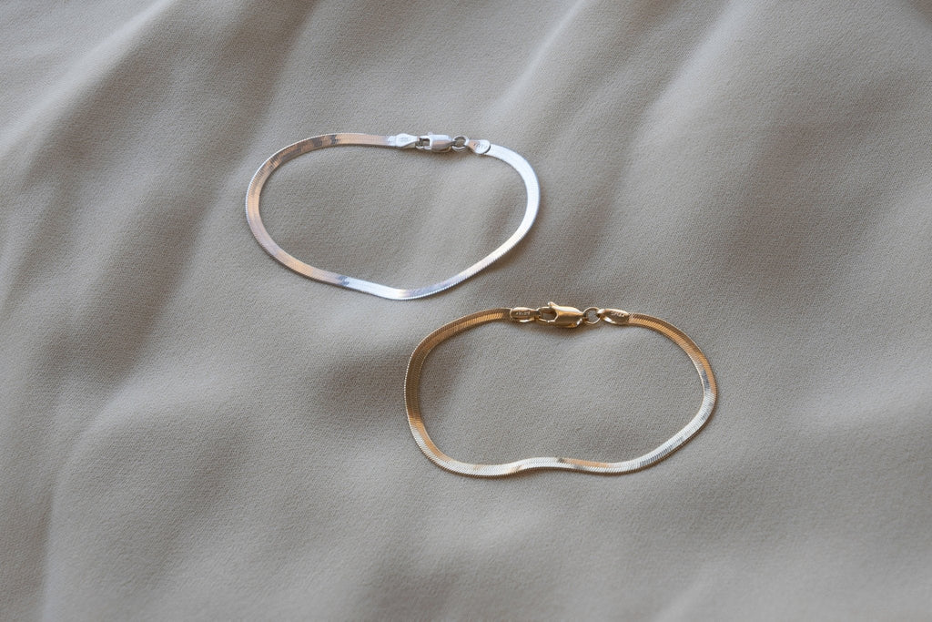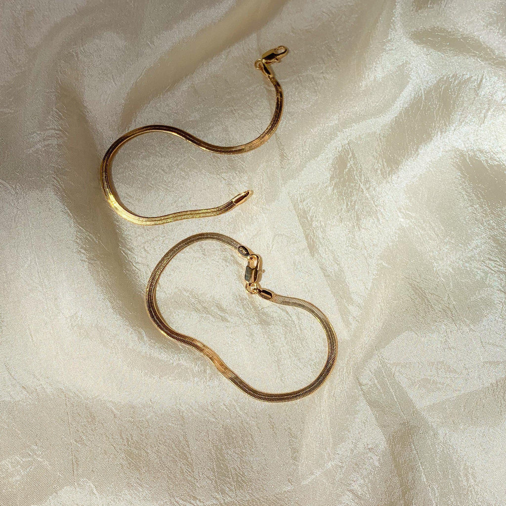 Liquid gold best describes this herringbone bracelet. This flat Herringbone chain catches the light and sits on your skin in the most graceful and slinky way.  Wear this gold herringbone bracelet alone or style it with your favorite stack. A flat herringbone bracelet that can be worn daily.