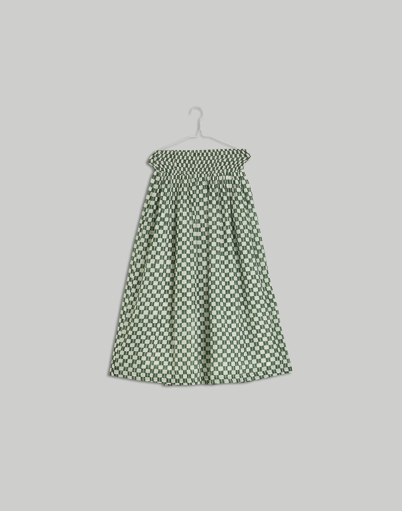 This flowing skirt, a collaboration with Erica and Dee Dee, features a comfortable, gathered elastic waistband and a repeating green and white checkered pattern with textured green squares. Pair this summer-perfect, casual style with a crisp white or cream tank top.