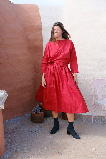 Designed in collaboration with Meredith Peck, this unique red skirt features a high elasticated waist for a perfect fit and a full, flowing drape for elegant movement. Complete with pockets, this versatile piece is as functional as it is stylish.