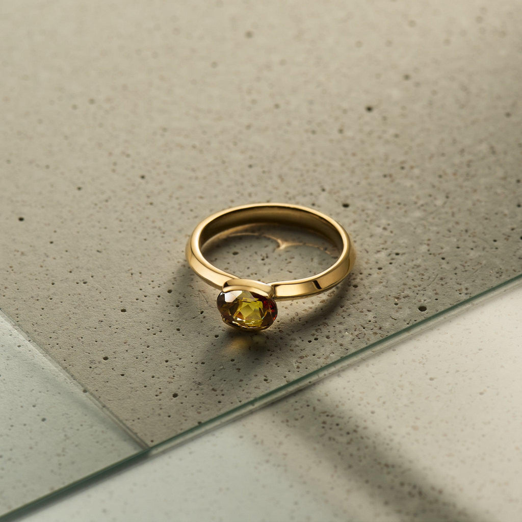 A beautiful, color changing Andalusite in varying shades of green and brown is set in a unique half-bezel setting on a 3mm knife-edge band. The color of the andalusite is perfectly neutral and grounding.