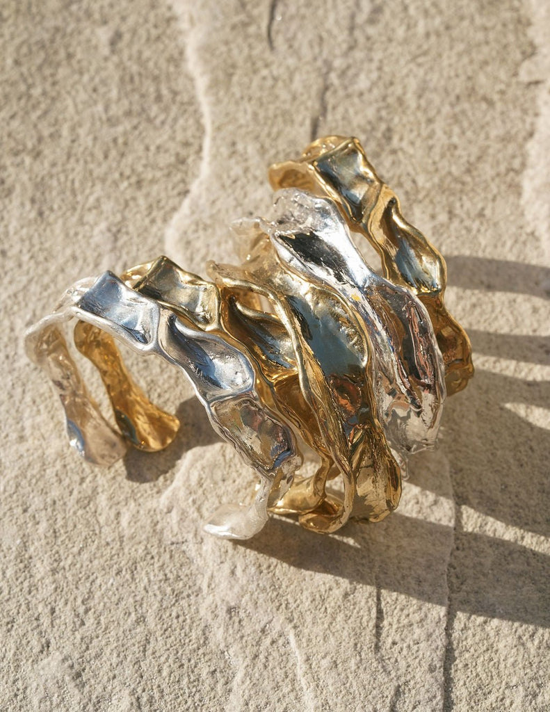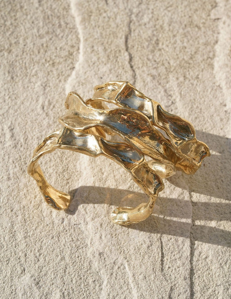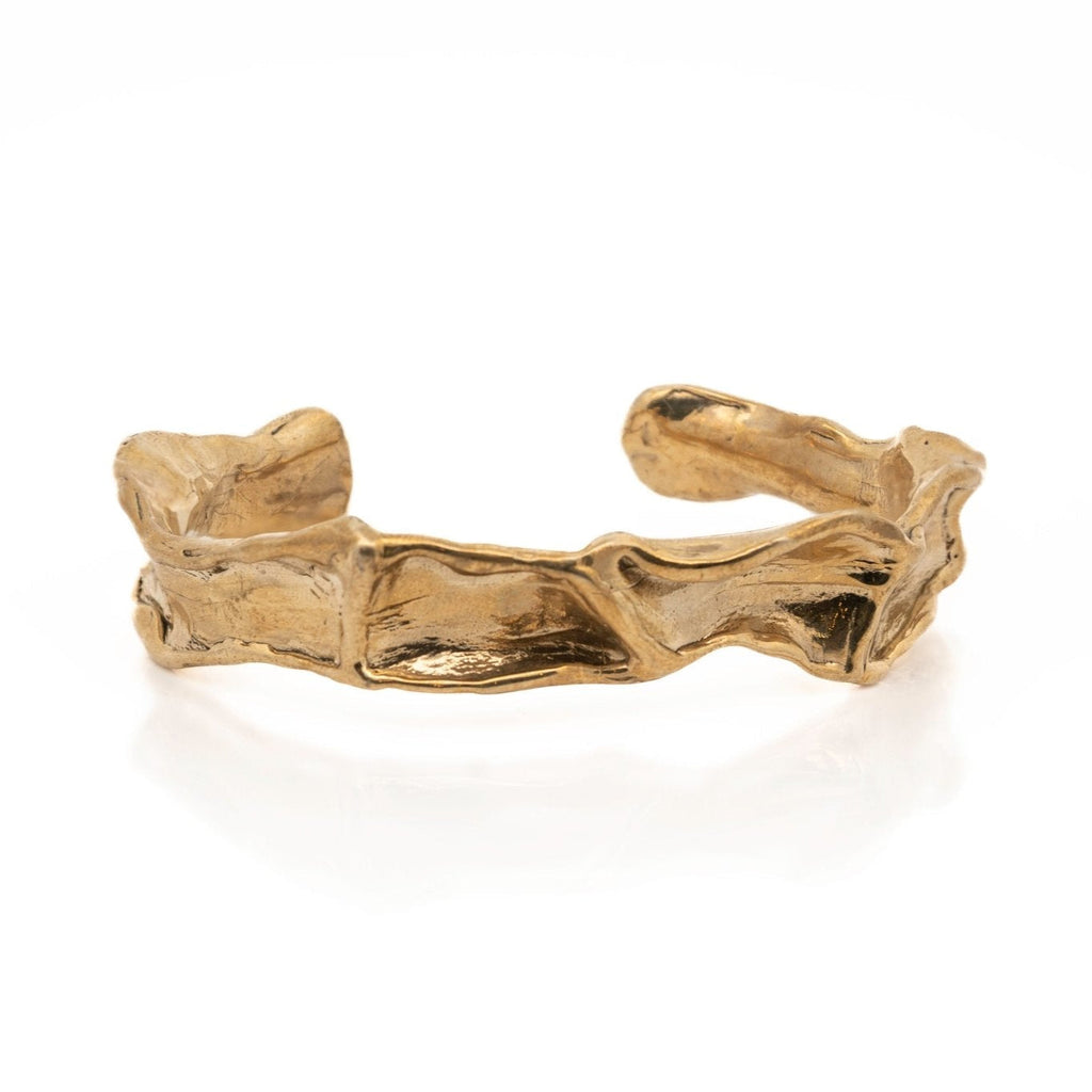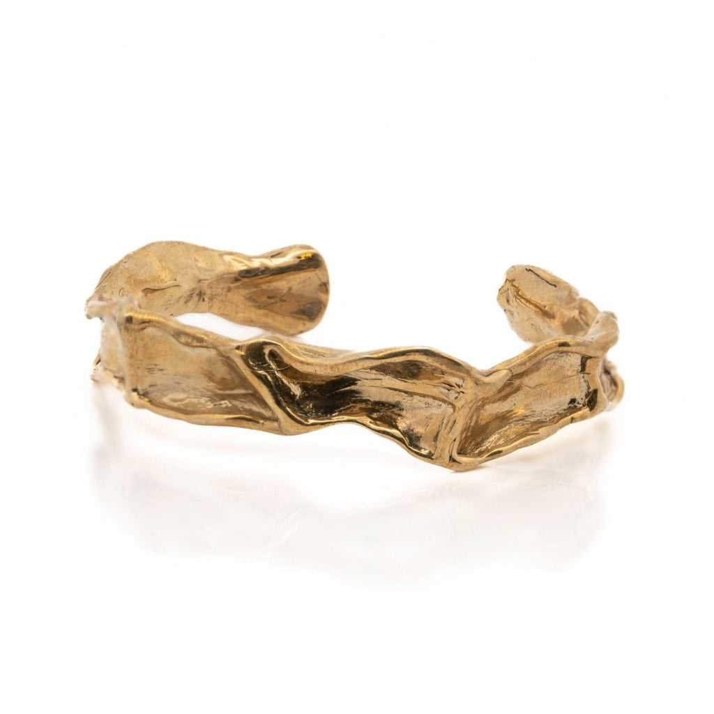 This unique gold bracelet was beautifully crafted by hand from wax, giving it a lively texture and captivating movement. It can be worn alone or paired with other bracelets, and its unisex sizing makes it a versatile accessory.