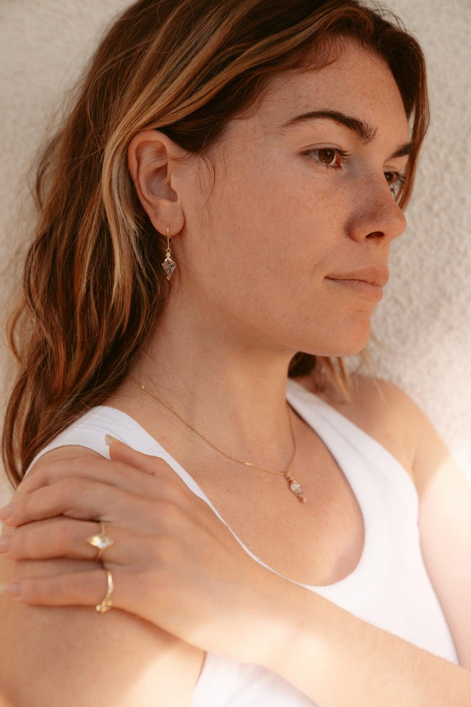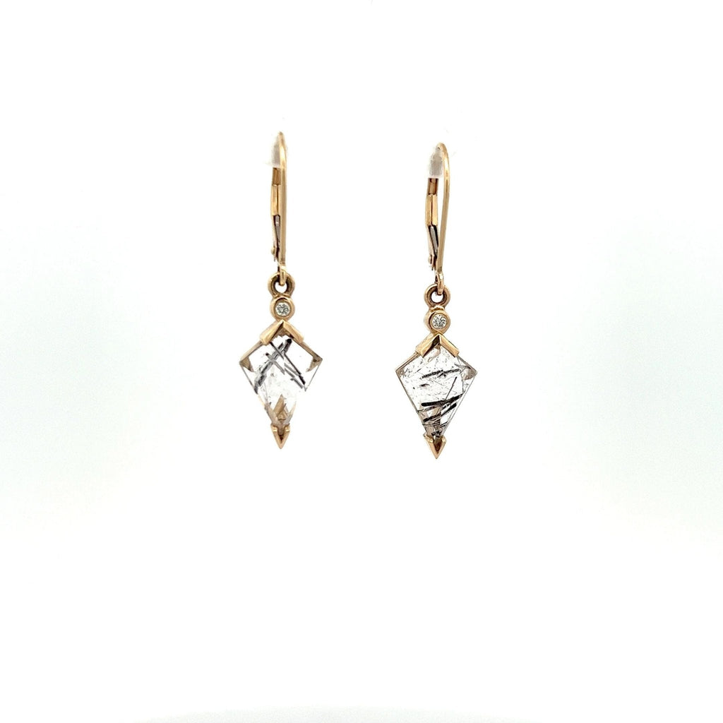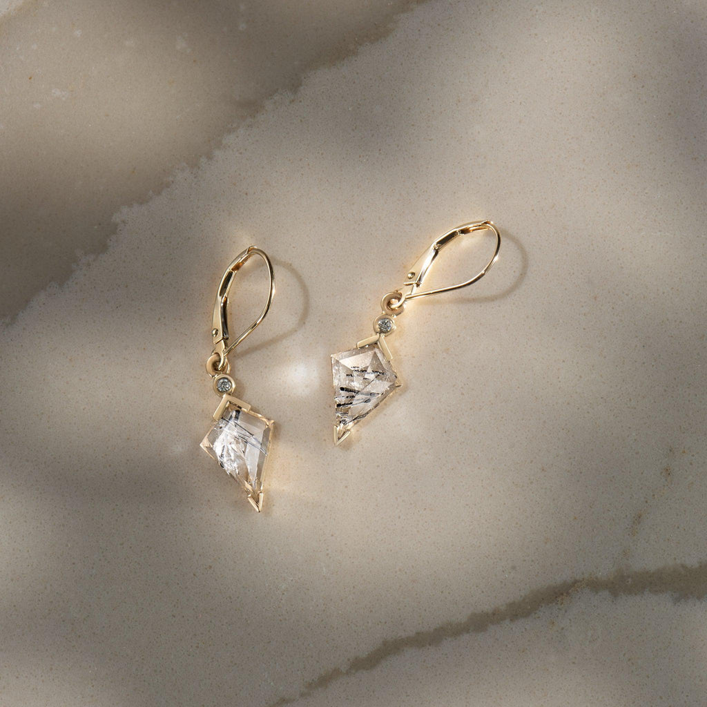 Thin black strands of tourmaline are captured inside this geometric kite cut quartz and accented with a small white diamond and set in 14k yellow gold. Finished with a 14k solid gold leverback earwire to ensure the earrings security.