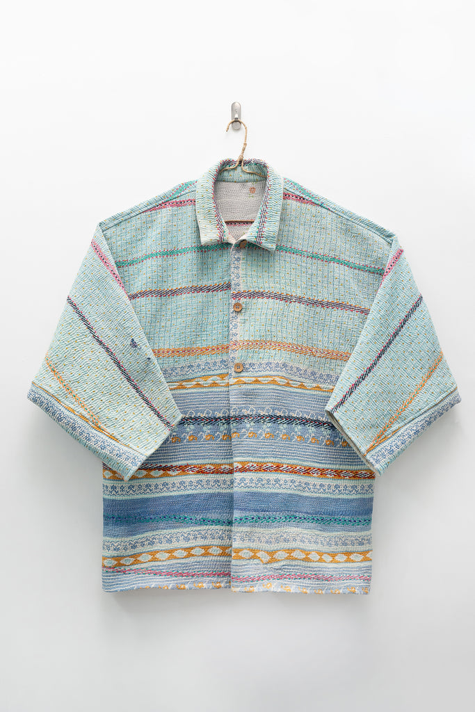 A tapestry of stories — pieced from vintage kantha quilts, this jacket blends deep plum stripes with vibrant bands of red, teal, and ochre. It’s a lightweight yet warm layer, made for crisp fall days, cool evenings, and slow mornings when comfort feels like a ritual. Every stitch carries history; every color holds a memory.