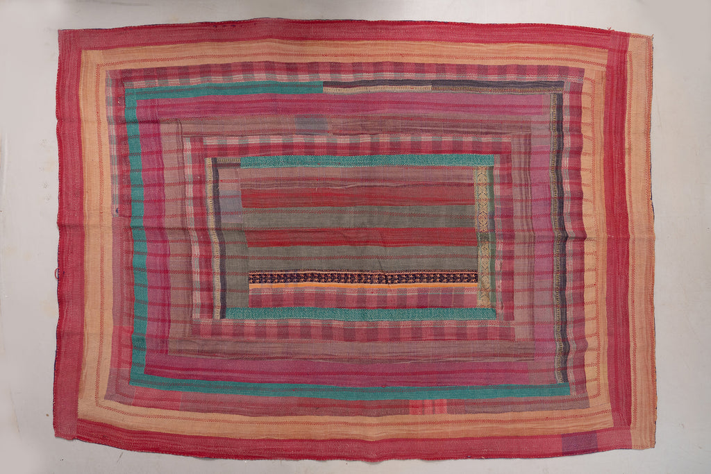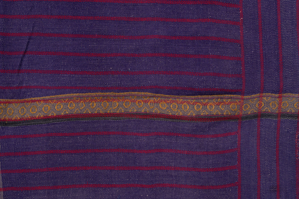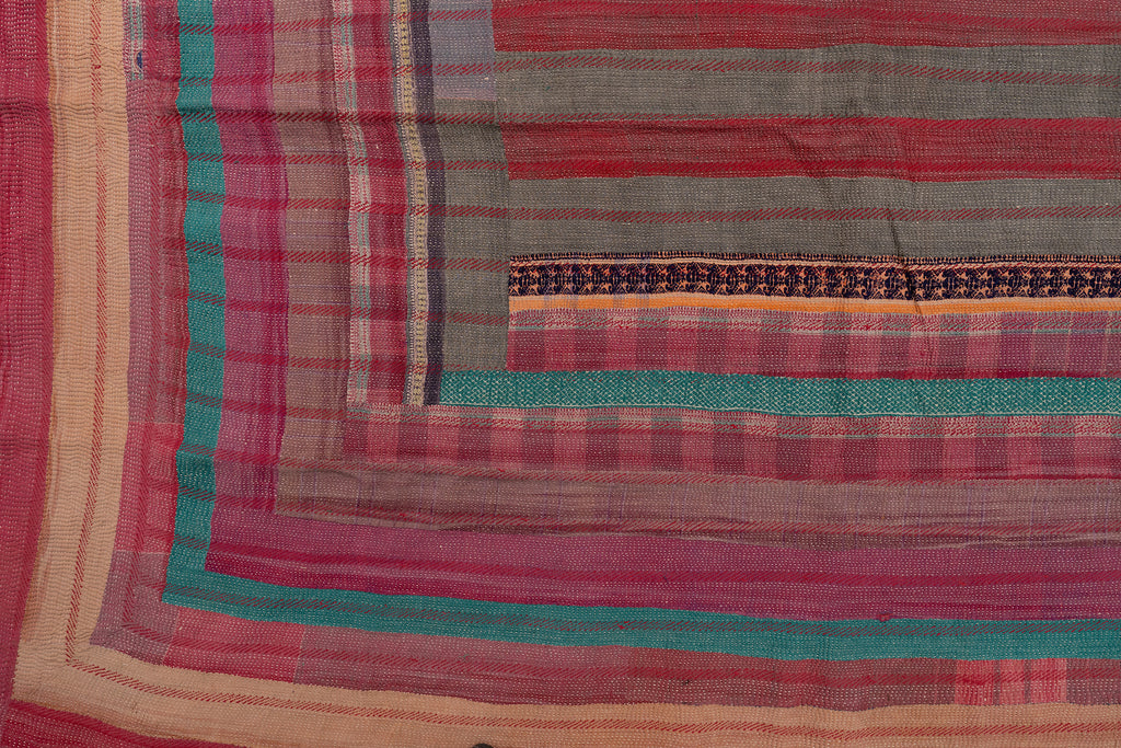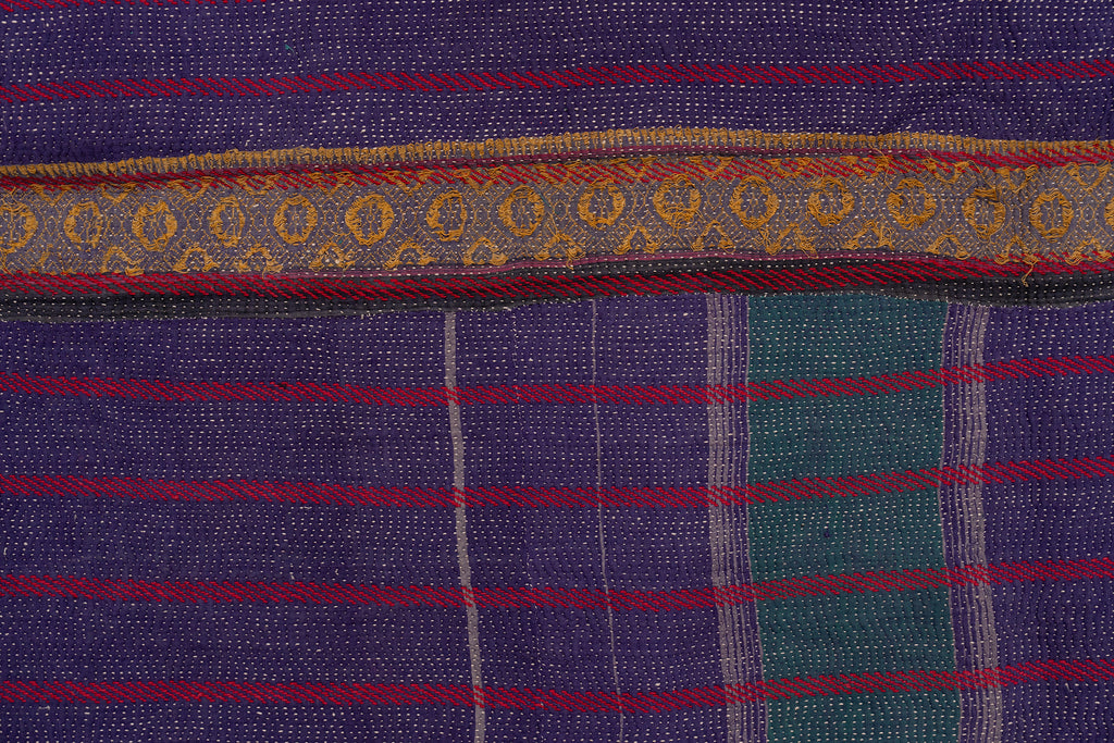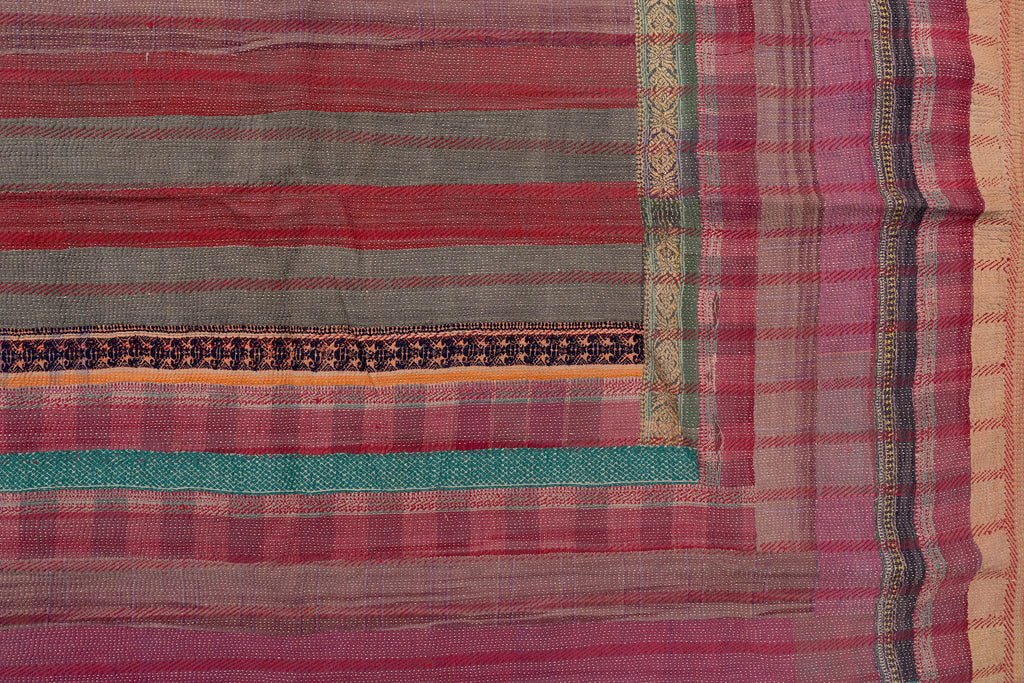 - Plum and ruby stripe base with multicolor kantha patchwork.