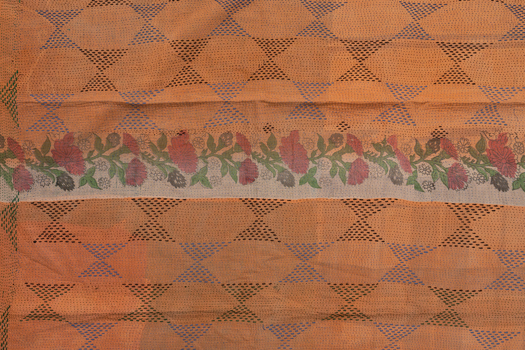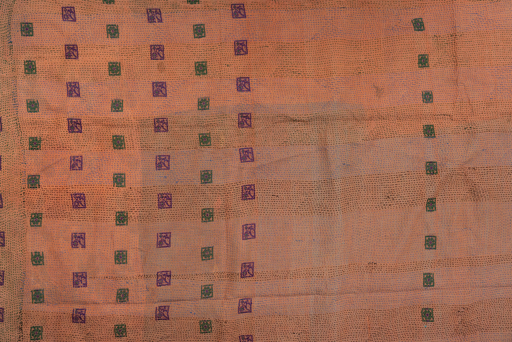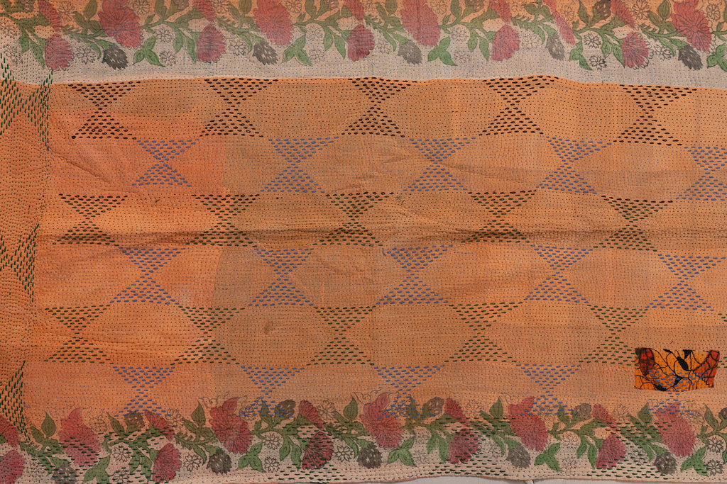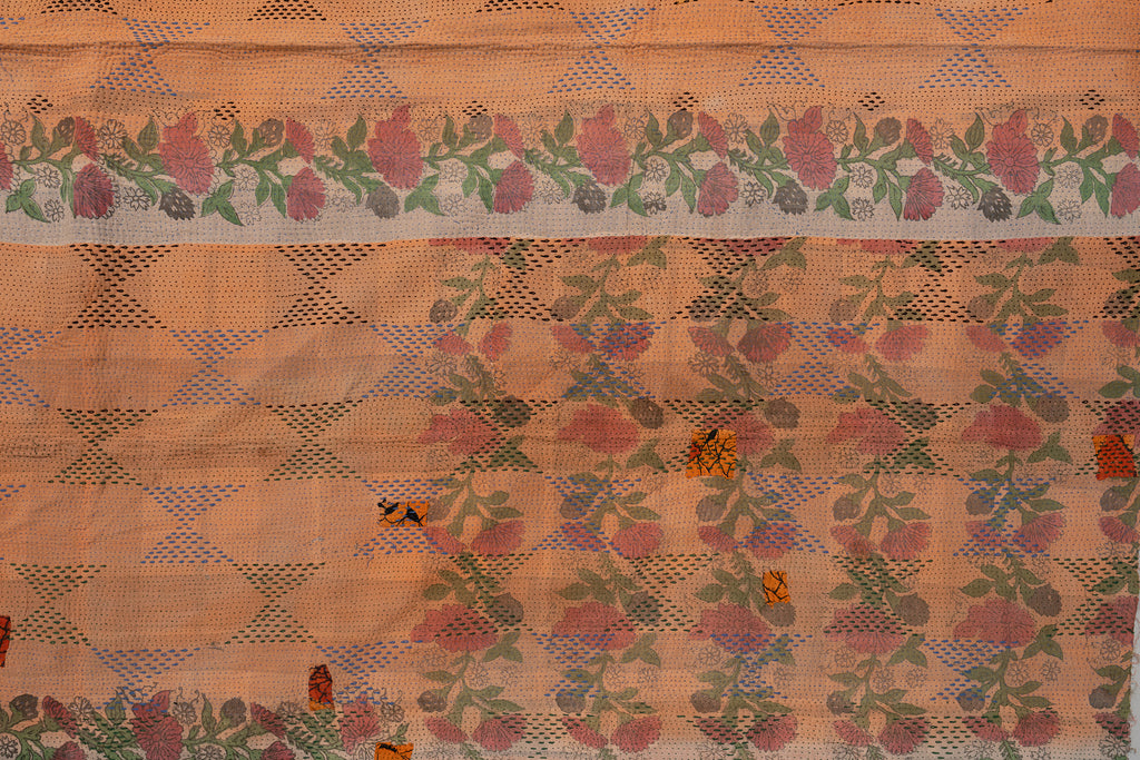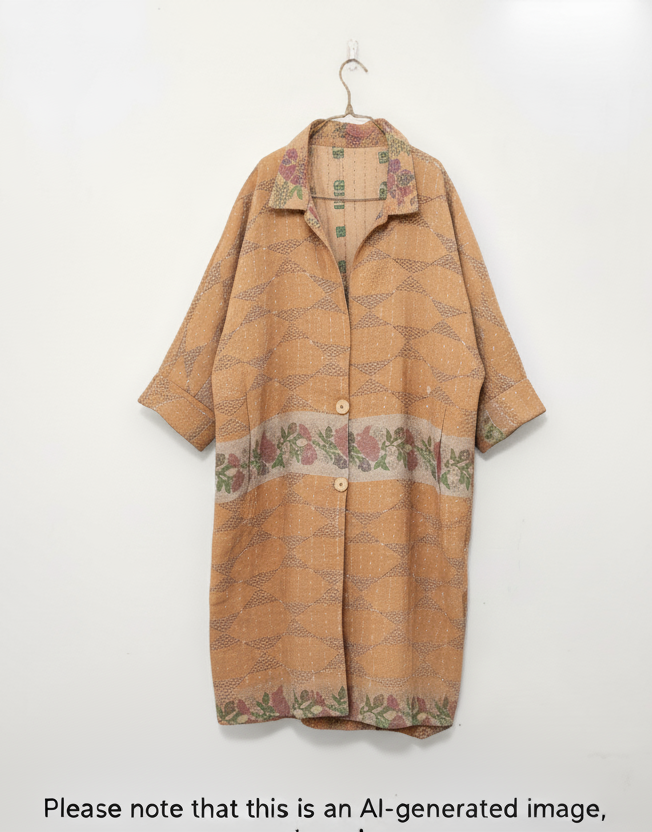 This reversible jacket is a celebration of soft, lived-in beauty one side washed in sun-baked peach with hand-stamped motifs, the other detailed with lattice patterns and blooming floral borders. Handcrafted from vintage cotton kantha, it’s a seasonless layer that holds warmth, memory, and the quiet poetry of timeworn cloth.