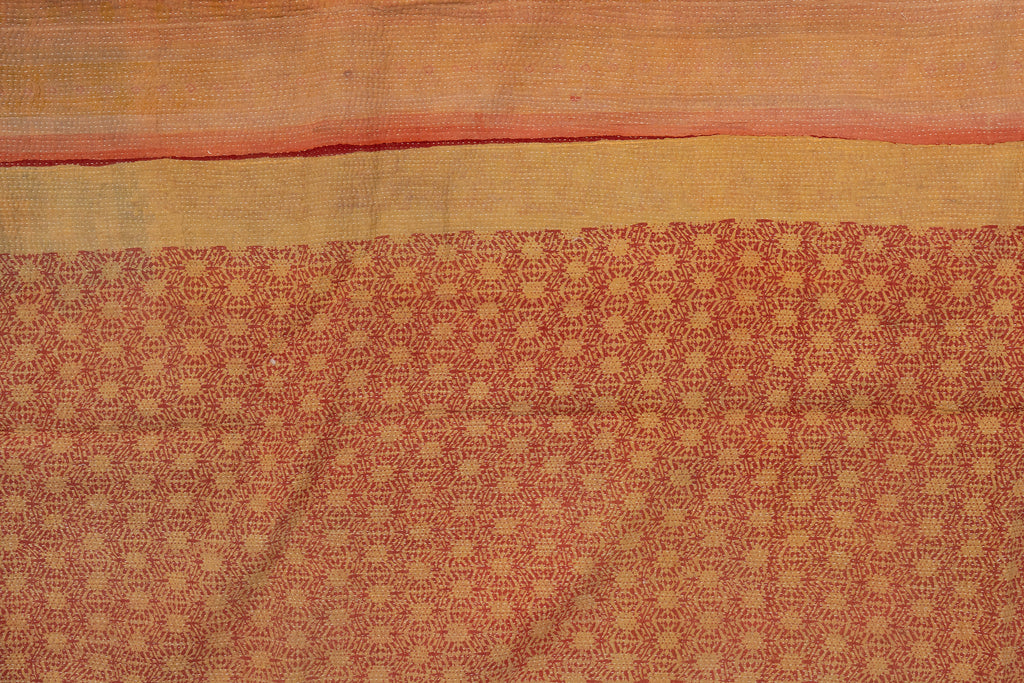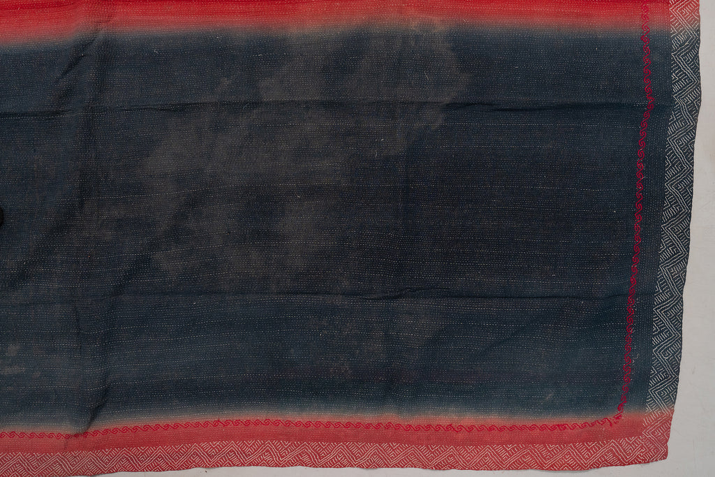 Crafted from vintage kantha quilts, these trousers feature deep charcoal tones washed with time, accented by a soft, sun-faded rust band running across the textile. The result is a piece that feels moody, minimal, and full of lived-in character—perfect for slow days and thoughtful dressing. Relaxed, textured, and seasonless.