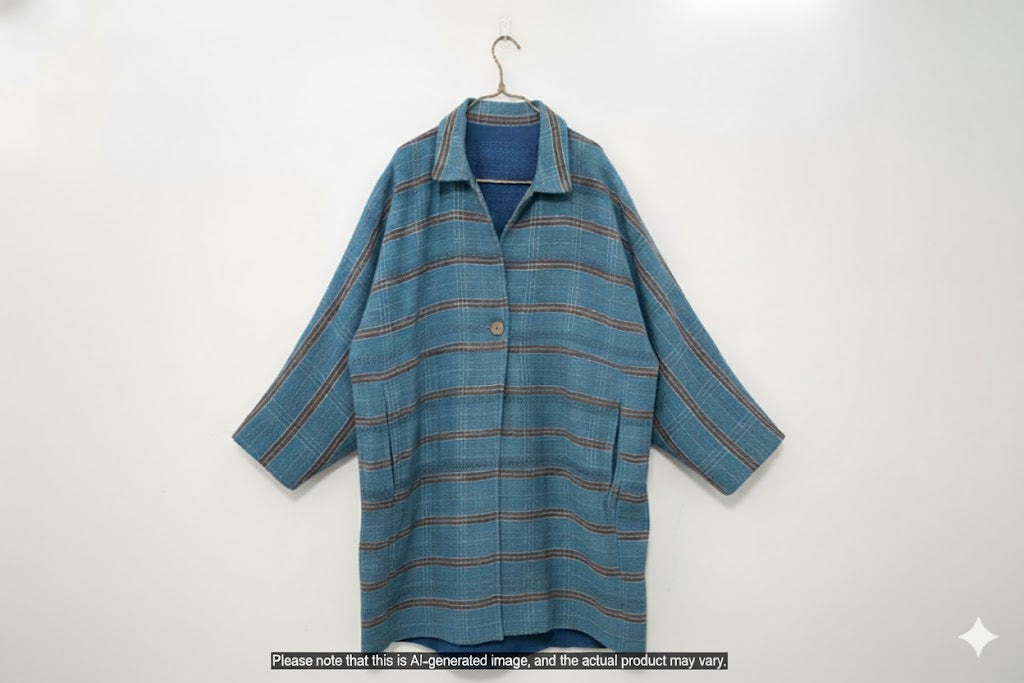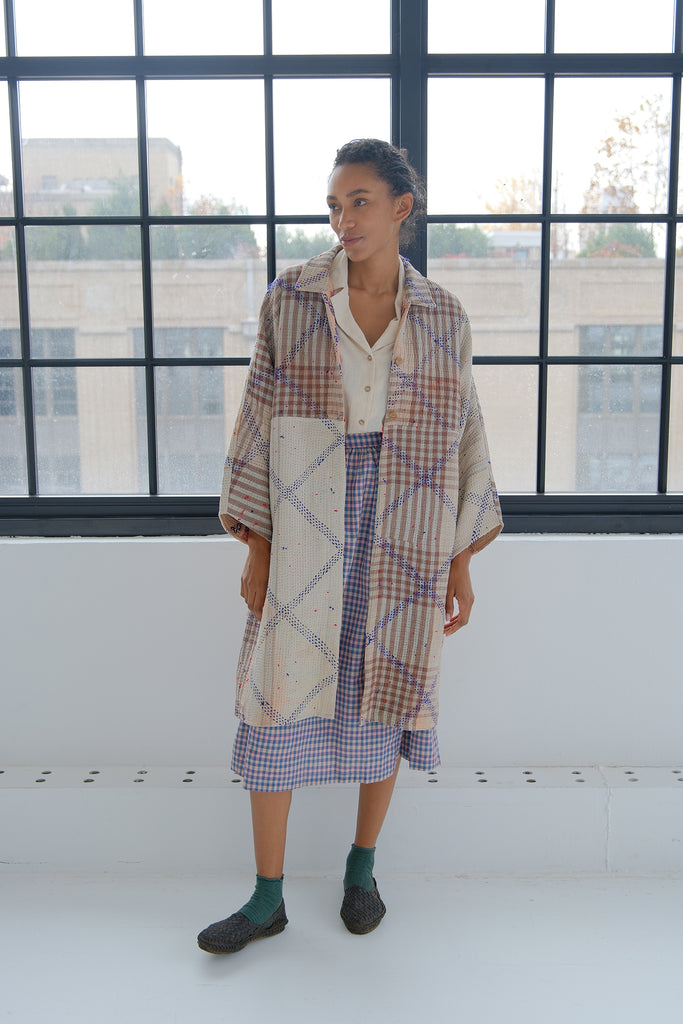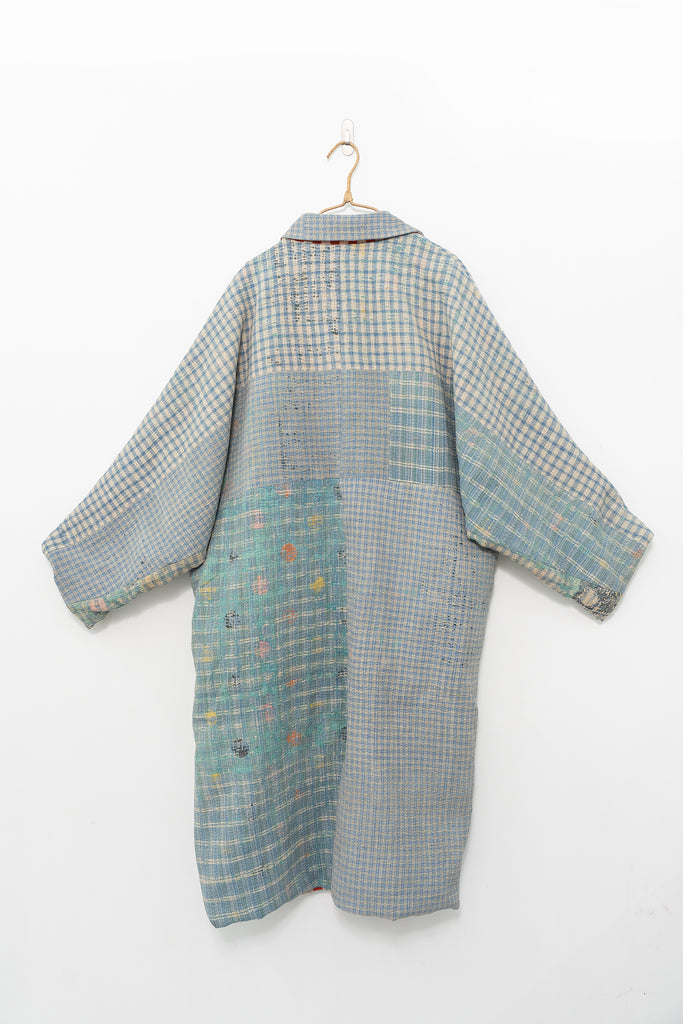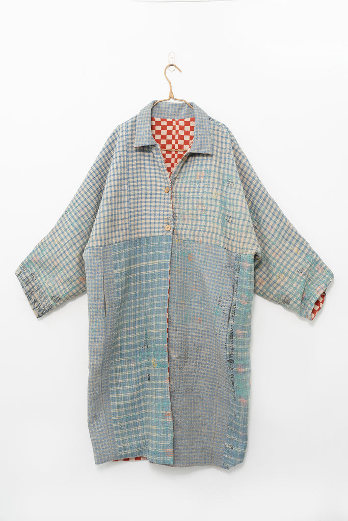 A coat woven in stories — one side awash in ocean blues, the other glowing in deep sunset reds. This reversible piece is crafted from vintage cotton kantha quilts, each layer hand-stitched and time-worn in the most beautiful way. A seasonless companion, it wraps you in warmth, texture, and history with every wear.