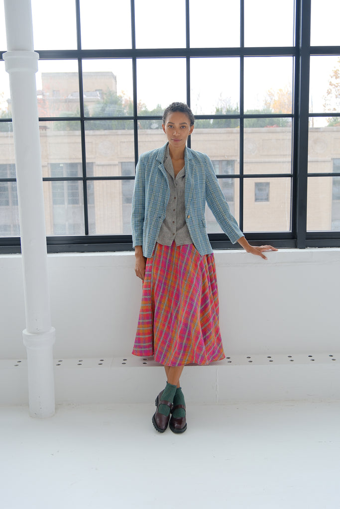 Full of warmth and rhythm, this flared skirt is woven in bright pink, amber, and plum checks — a celebration of color and craftsmanship. The gathered waist allows soft volume and movement.