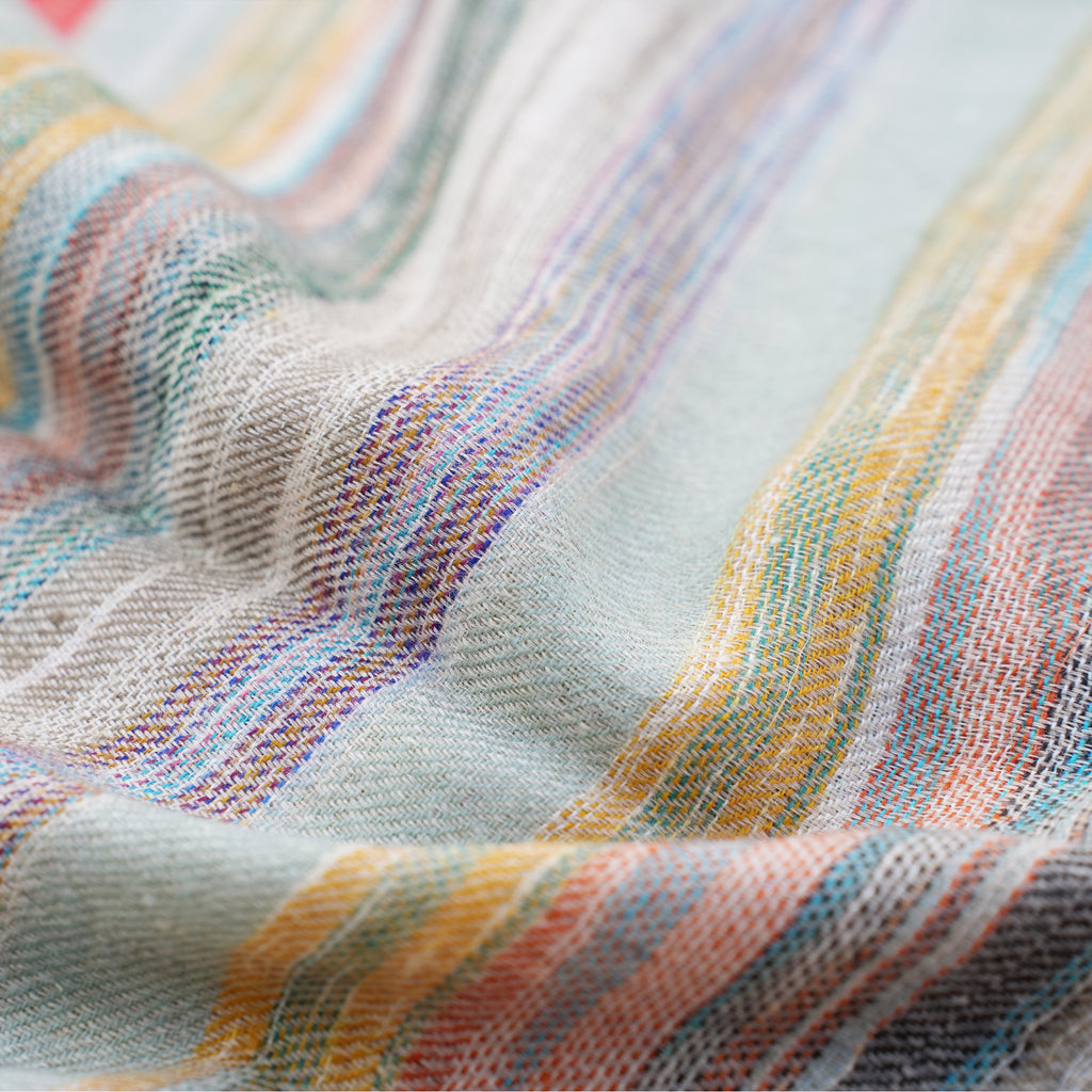 Our fabrics are crafted from natural materials, including 100% hand-woven cotton, linen, wool, and silk. We use traditional techniques carried out by skilled artisans. The processes of hand-weaving, hand-dyeing, and hand-block printing are prone to slight irregularities, which make each piece one-of-a-kind.