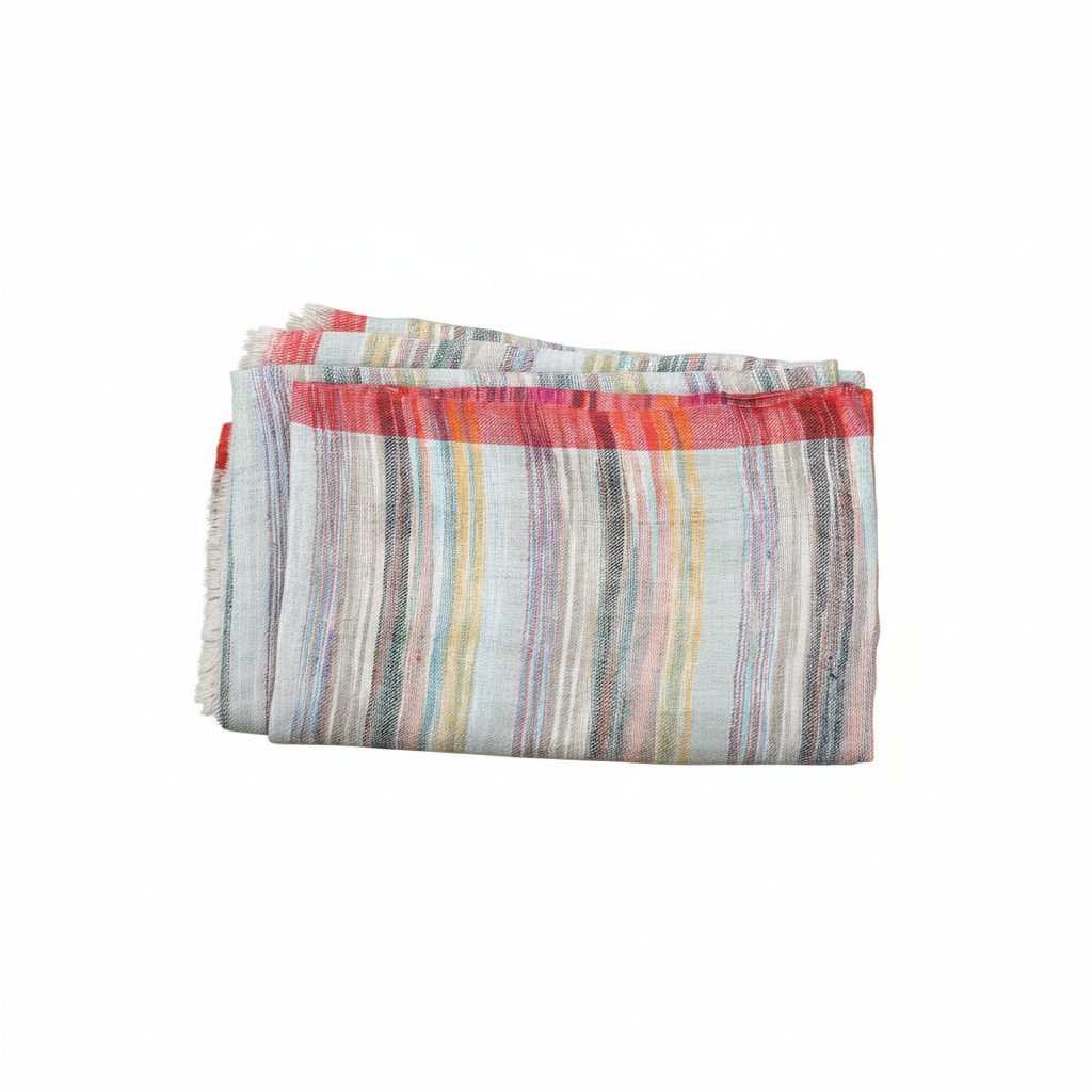 Handwoven from fine pashmina, this shawl pairs a soft beige base with vibrant multi-color stripes and striking red borders. Lightweight, cozy, and stylish, it’s the perfect accessory for adding elegance to any outfit.