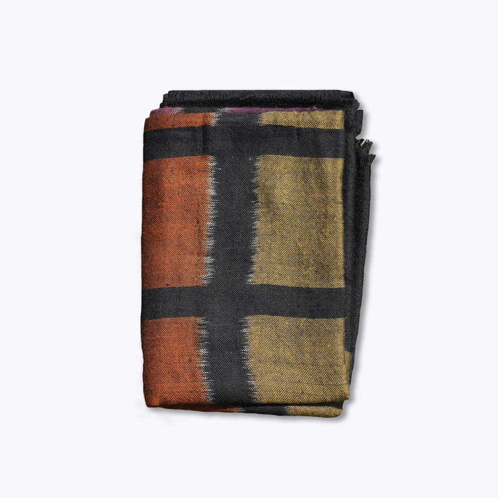 This is a bold Pashmina Ikat shawl with a striking, geometric design. The top half features a hand-dyed Ikat pattern of rust orange and golden brown squares framed by deep black lines, while the bottom is a solid block of the same black. The handwoven quality makes it a perfect blend of traditional artistry and modern style.