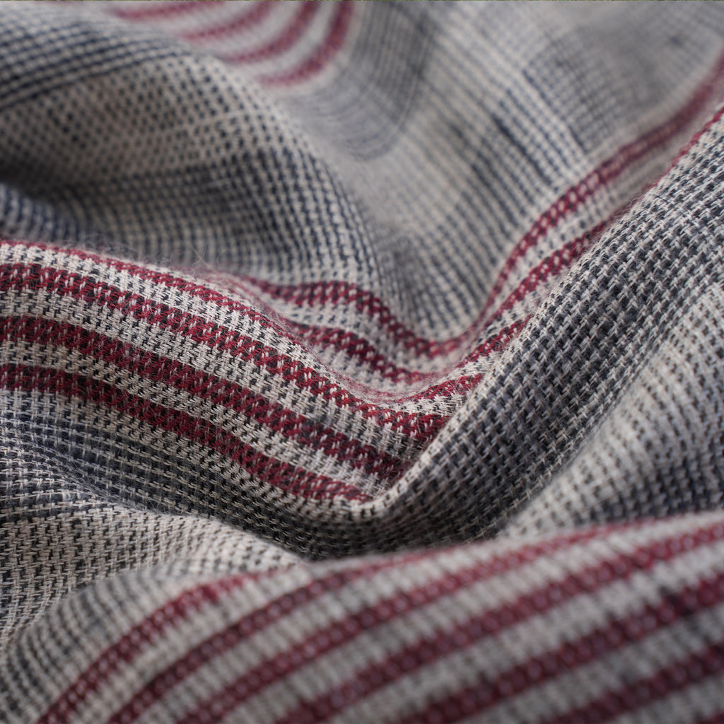 Our fabrics are crafted from natural materials, including 100% hand-woven cotton, linen, wool, and silk. We use traditional techniques carried out by skilled artisans. The processes of hand-weaving, hand-dyeing, and hand-block printing are prone to slight irregularities, which make each piece one-of-a-kind.