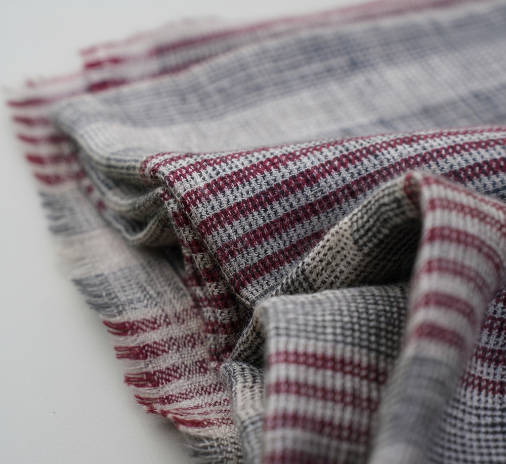 This is a timeless and elegant Pashmina shawl that features a classic striped pattern. Its beautiful, handwoven texture combines a base of natural gray and beige with rich maroon and charcoal stripes. The shawl's authentic, hand-finished fringe and luxurious feel make it a versatile accessory that adds warmth and sophisticated style to any look.