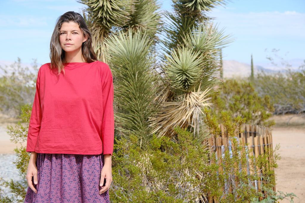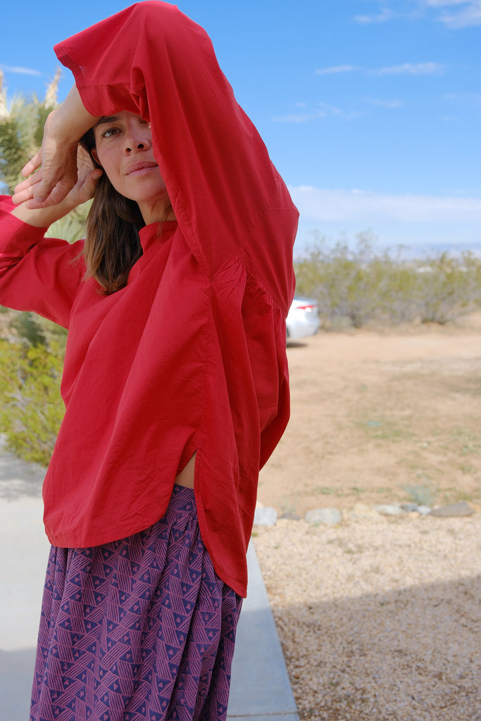 Designed in collaboration with Meredith Peck, this chic red top offers a relaxed, comfortable fit with a flattering boat neckline with a single button closure at the back and a wide, flowing silhouette. The modern high-low hemline and 3/4 length sleeves make it a versatile piece for effortless style.