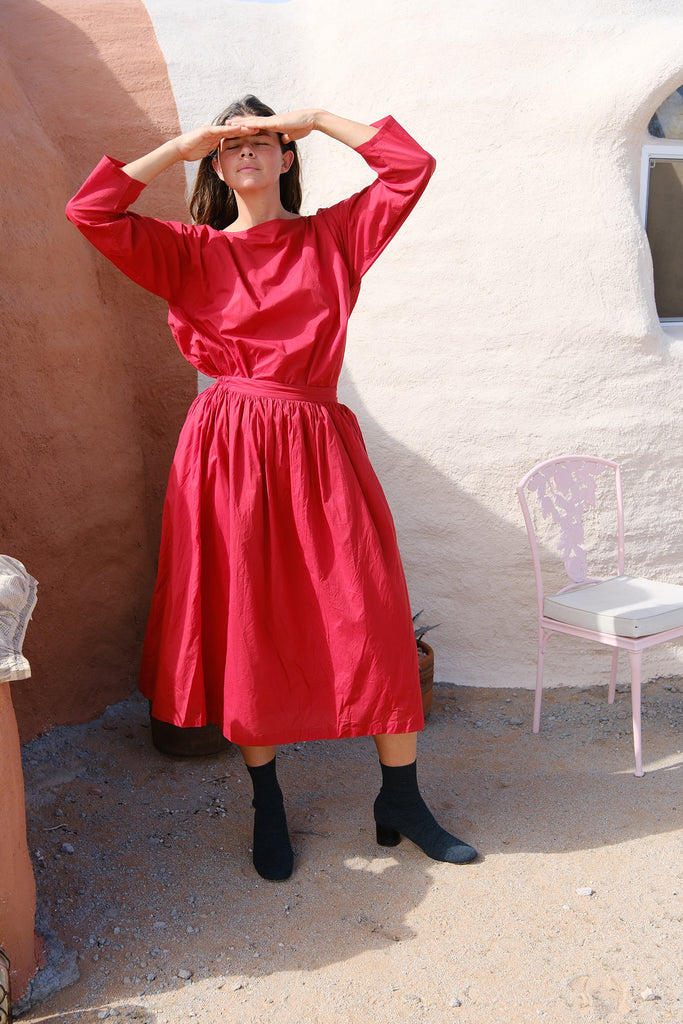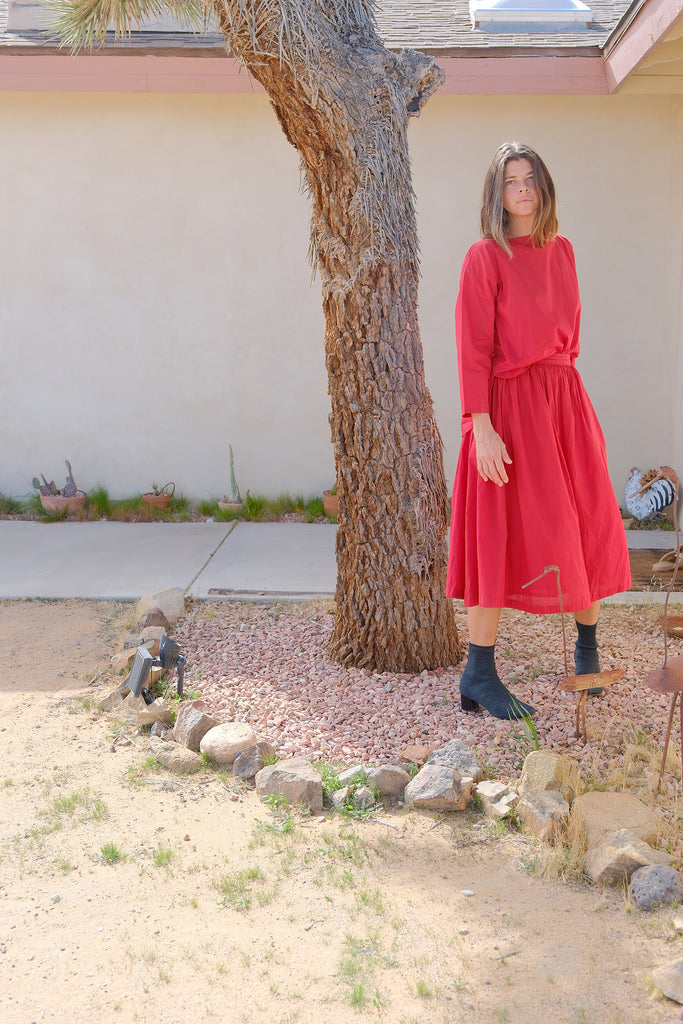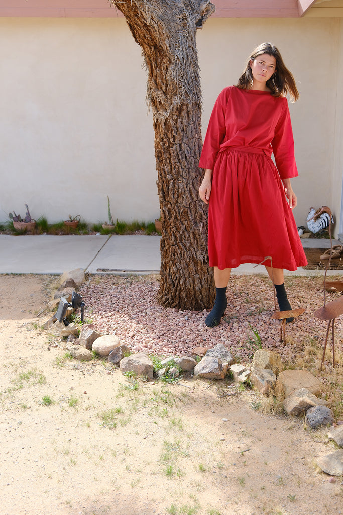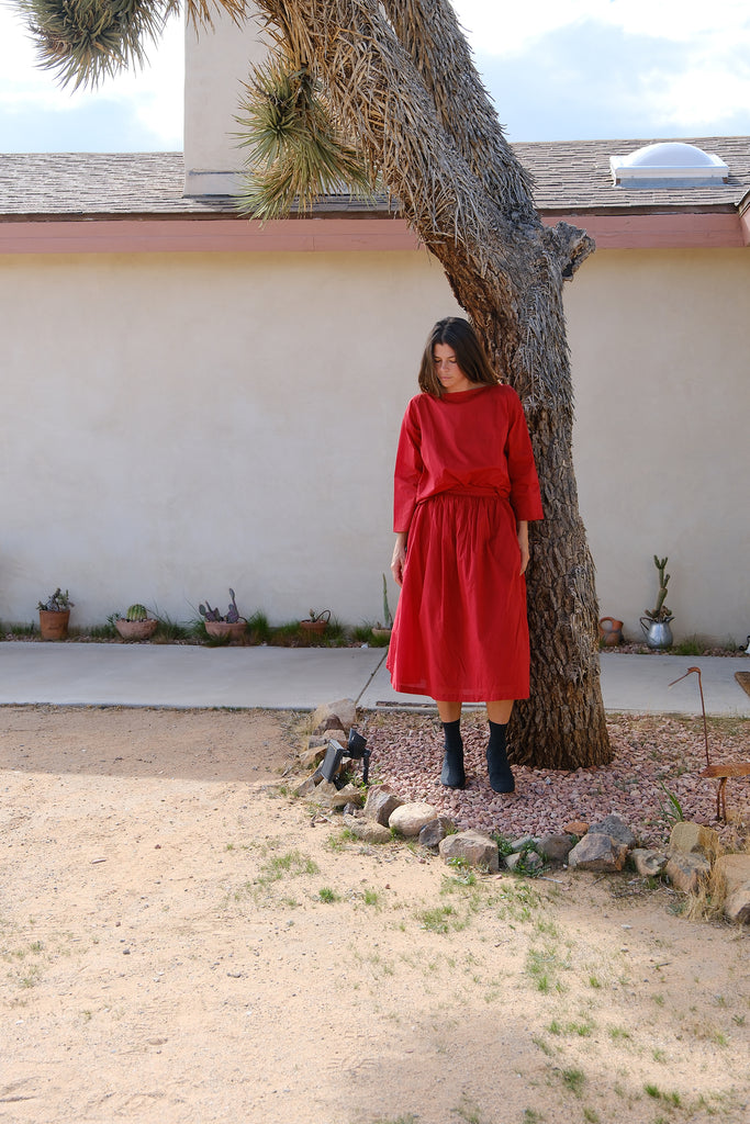 Designed in collaboration with Meredith Peck, this unique red skirt features a high elasticated waist for a perfect fit and a full, flowing drape for elegant movement. Complete with pockets, this versatile piece is as functional as it is stylish.