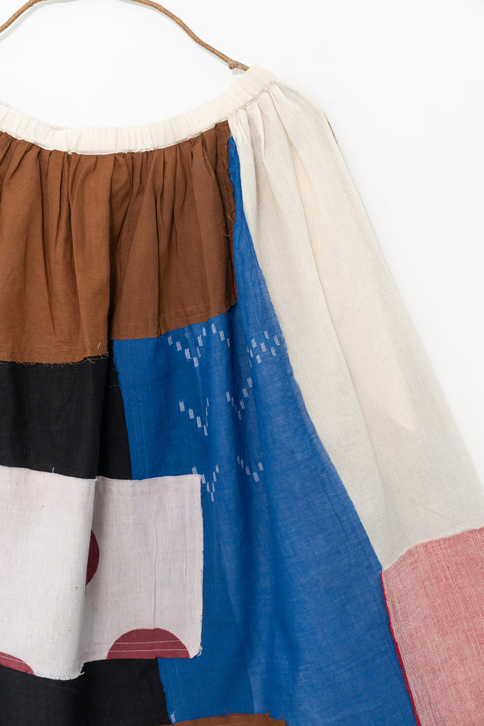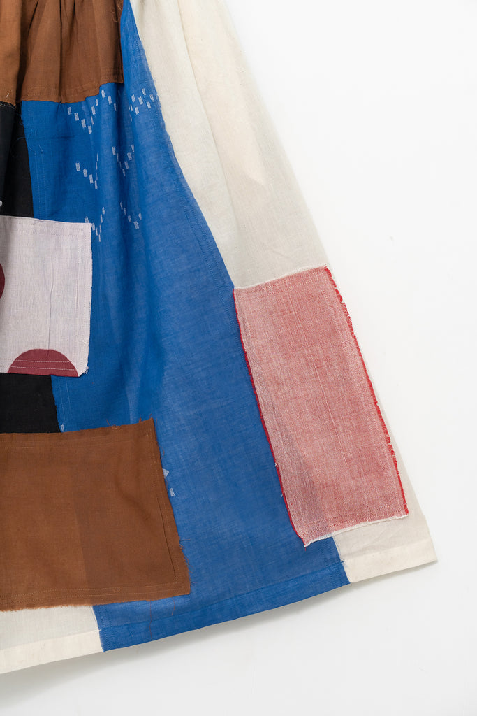 A celebration of craft and color, this patchwork skirt combines hand-printed motifs and solid hues — dots, grids, and plains — all composed from leftover organic cotton panels. Designed in collaboration with Meredith Peck, each piece is one-of-a-kind, hand-stitched, and dyed with azo-free pigments for a modern artisanal feel.