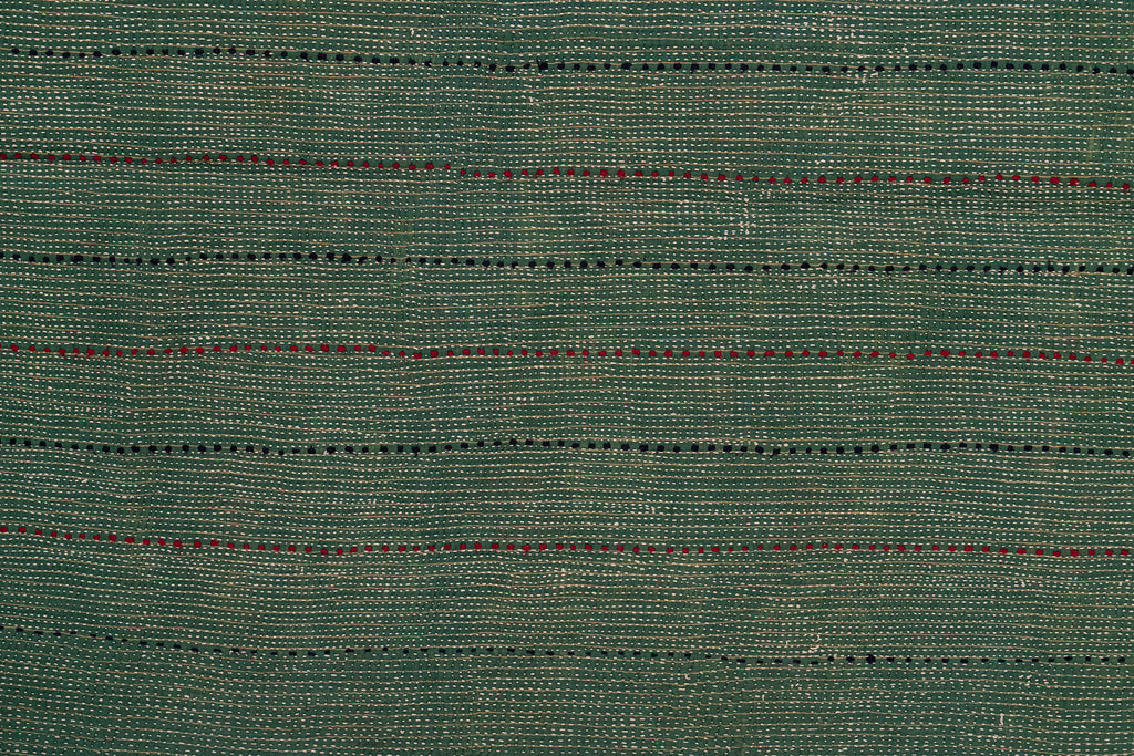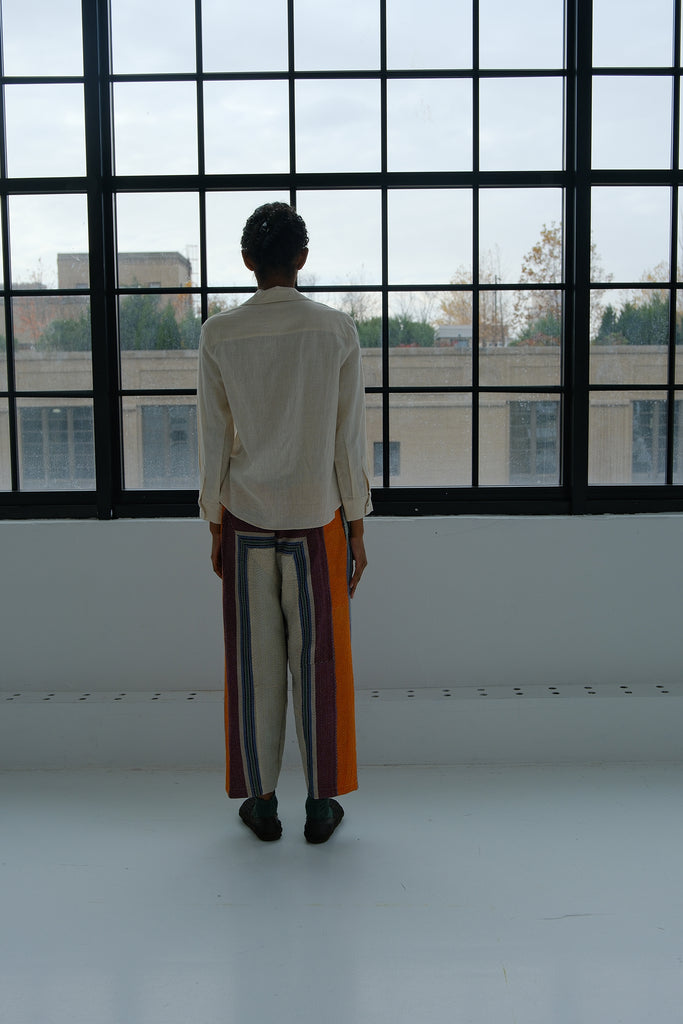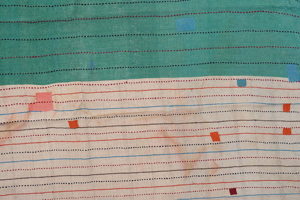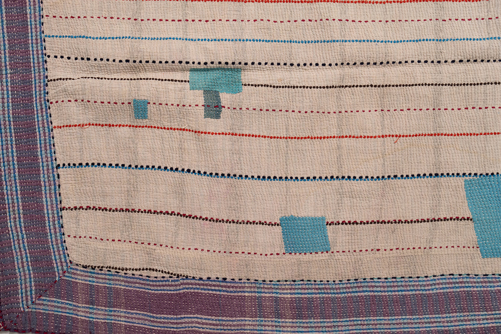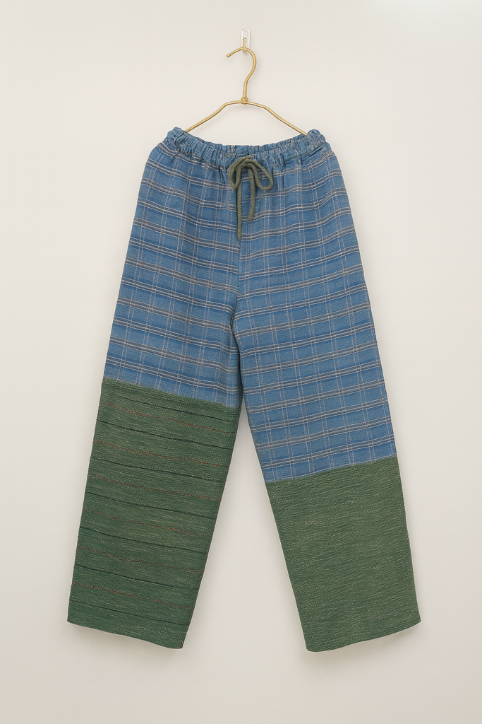 Crafted from vintage kantha quilts, these pants evoke a serene landscape, blending a plaid of sky blues and muted greys with a rich olive green earth section. Running stitches and small, considered patches tell the story of their past life. Relaxed, tactile, and effortlessly wearable through the seasons.