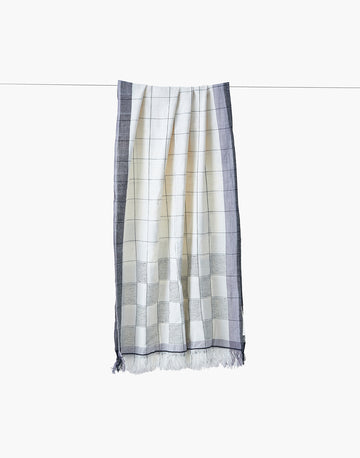 This elegant hand-spun and handwoven Maheshwari stole in pure cotton showcases a modern check pattern in off-white and varied shades of grey. Featuring large intersecting blocks and delicate fringed edges, it is dyed with eco-friendly azo-free vat dyes for a stylish yet sustainable finish.