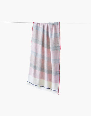 This elegant hand-spun and handwoven Maheshwari stole made from pure conventional cotton features a modern design with broad horizontal stripes in soft off-white, blush pink, and muted blue. The stole is bordered with a vibrant red stripe along the side and finished with a delicate fringe. This piece is colored with azo-free vat dyes, ensuring a high-quality product that is both safe and stylish.
