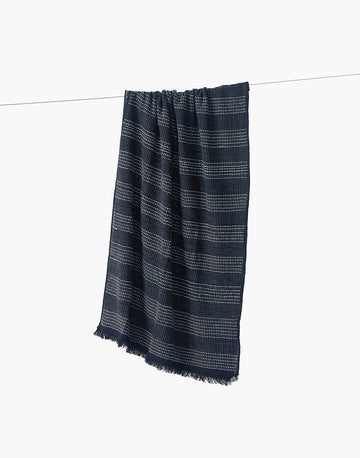 This sophisticated hand-spun and handwoven Maheshwari shawl is made from pure conventional cotton. It features a modern, fine grid pattern in a striking navy and off-white horizontal weft stripes all over.Finished with soft fringes and dyed using eco-friendly azo-free vat dyes, it is a lightweight, versatile, and sustainable accessory for everyday wear or special occasions.