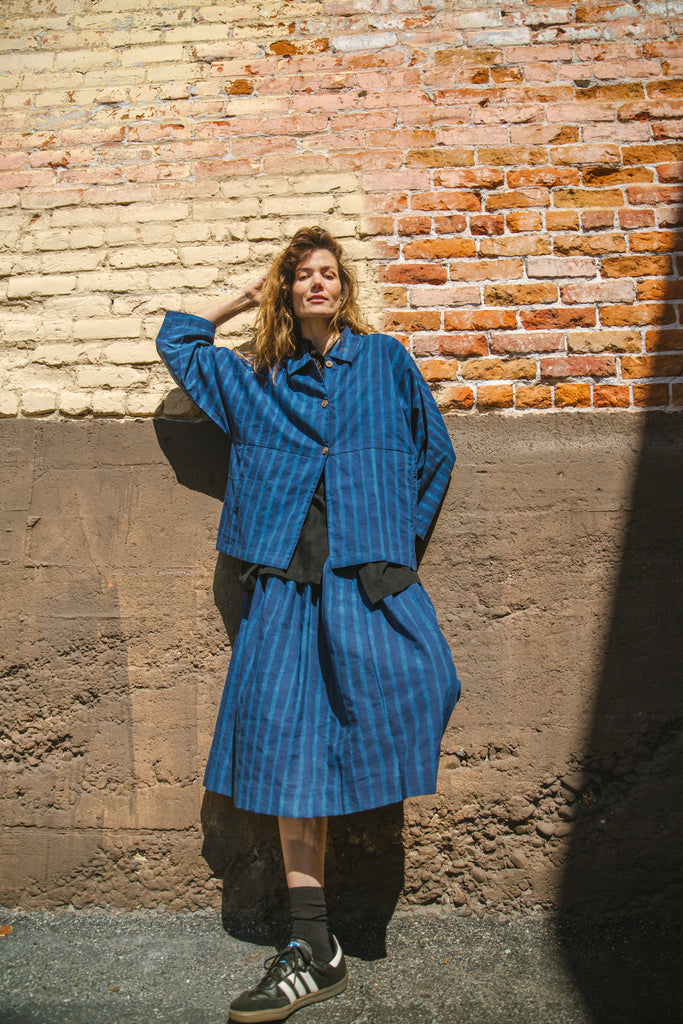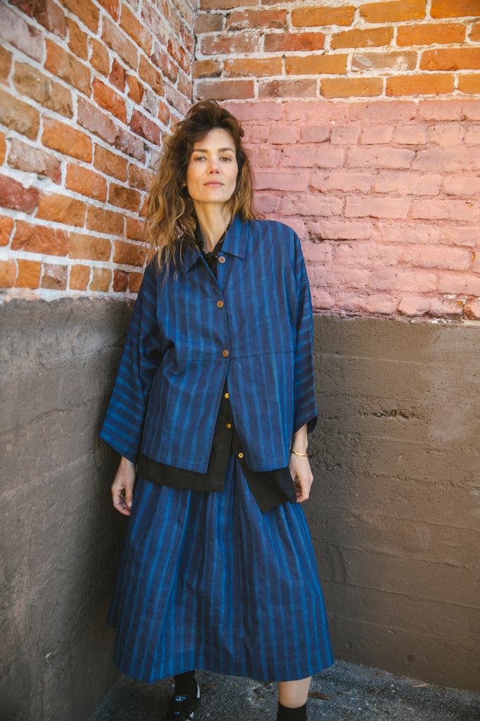 Designed in collaboration with Joyce Lee and World of Crow, this statement shirt features vibrant stripes and subtle patterns on a deep indigo background. Wear it open over a t-shirt or tank top for a versatile, layered look.